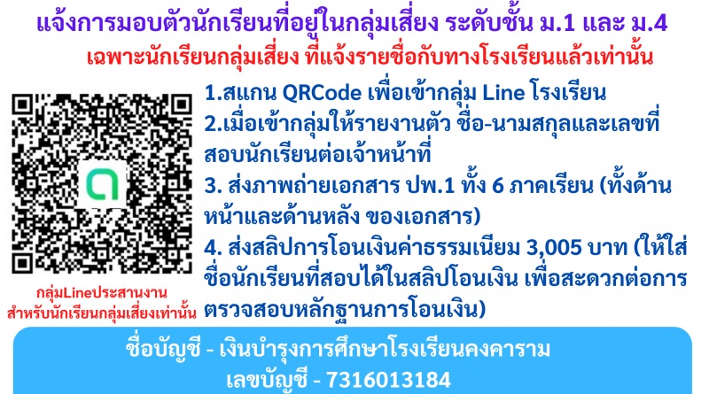 แจ้งการมอบตัวนักเรียนที่อยู่ในกลุ่มเสี่ยง ระดับชั้น ม.1 และ ม.4