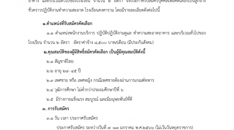 ด้วยโรงเรียนคงคาราม จังหวัดเพชรบุรี สำนักงานเขตพื้นที่การศึกษามัธยมศึกษาเพชรบุรี มีความประสงค์จะรับสมัครบุคคลทั่วไปเป็นลูกจ้างชั่วคราว ตำแหน่ง พนักงานบริการ ปฏิบัติงานดูแล ทำความสะอาดอาคาร และบริเวณทั่วไปของโรงเรียน จำนวน ๒ อัตรา จึงประกาศรับสมัครบุคคลเพื่อคัดเลือกเป็นลูกจ้างชั่วคราวปฏิบัติงานทำความสะอาด อัตราค่าจ้าง ๘,๕๐๐ บาท/เดือน (มีประกันสังคม)