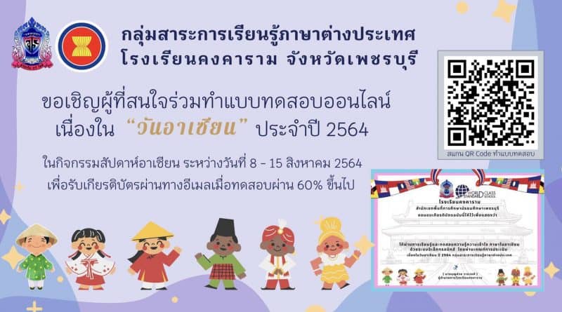 เชิญชวนนักเรียนและคุณครูทุกท่านเข้าร่วมทำแบบสอบถามกิจกรรม”สัปดาห์อาเซียน”โดยตอบแบบสอบถามเกี่ยวกับภาษาในอาเซียนเมื่อทำผ่านเกณฑ์ที่กำหนด 60% สามารถรอรับเกียรติบัตรผ่านทางออนไลน์ (สำหรับนักเรียนที่เรียนวิชาภาษาจีนสามารถนำเกียรติบัตรรับคะแนนเพิ่มที่คุณครูประจำวิชา)
