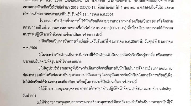 ด้วยสถานการณ์แพร่ระบาดของโรคติดเชื้อไวรัสโคโรนา2019 (COVID-19) ประกาศปิดเรียนตั้งแต่วันจันทร์ที่ 4 มกราคม 2564 เป็นต้นไป และเปิดการเรียนการสอนตามปกติในวันจันทร์ที่ 11 มกราคม 2564