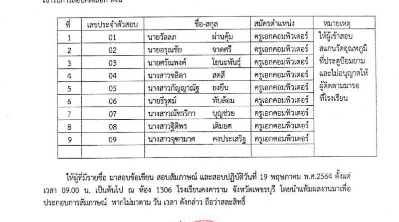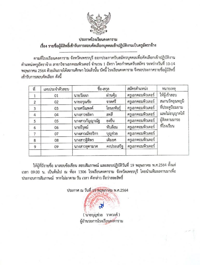 เรื่อง รายชื่อผู้มีสิทธิ์เข้ารับการสอบคัดเลือกบุคคลเข้าปฏิบัติงานเป็นครูอัตราจ้าง ตามที่โรงเรียนคงคาราม จังหวัดเพชรบุรี ออกประกาศรับสมัครบุคคลเพื่อคัดเลือกเข้าปฏิบัติงาน ตำแหน่งครูอัตราจ้าง สาขาวิชาเอกคอมพิวเตอร์ จำนวน 1 อัตรา