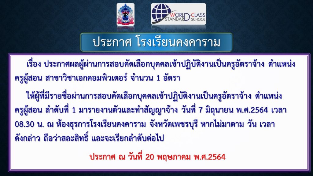 ให้ผู้ที่มีรายชื่อผ่านการสอบคัดเลือกบุคคลเข้าปฏิบัติงานเป็นครูอัตราจ้าง ตำแหน่งครูผู้สอน ลำดับที่ 1 มารายงานตัวและทำสัญญาจ้าง วันที่ 7 มิถุนายน พ.ศ.2564 เวลา 08.30 น. ณ ห้องธุรการโรงเรียนคงคาราม จังหวัดเพชรบุรี หากไม่มาตาม วัน เวลา ดังกล่าว ถือว่าสละสิทธิ์ และจะเรียกลำดับต่อไป