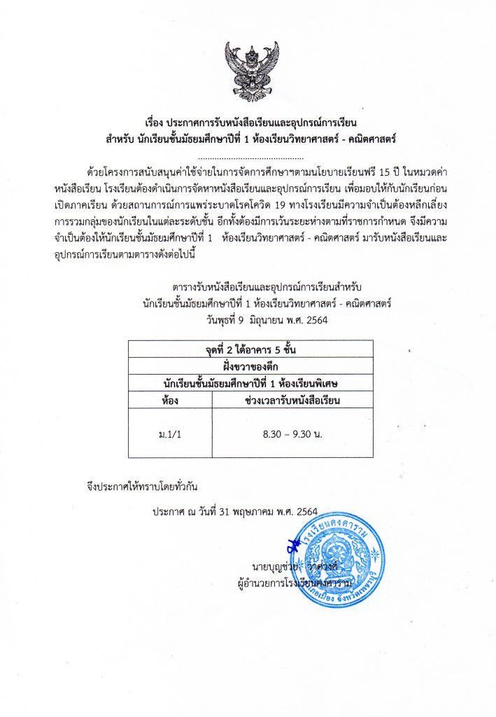 เรื่อง ประกาศการรับหนังสือเรียนและอุปกรณ์การเรียน สำหรับ นักเรียนชั้น ม.1/1 ห้องเรียนวิทยาศาสตร์ คณิตศาสตร์ ระดับ ม.4 กลุ่มโควต้า และระดับชั้นมัธยมศึกษาปีที่ 2 – ชั้นมัธยมศึกษาปีที่ 6