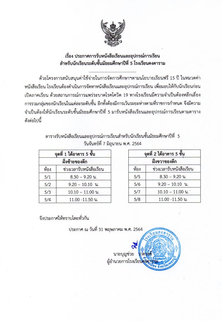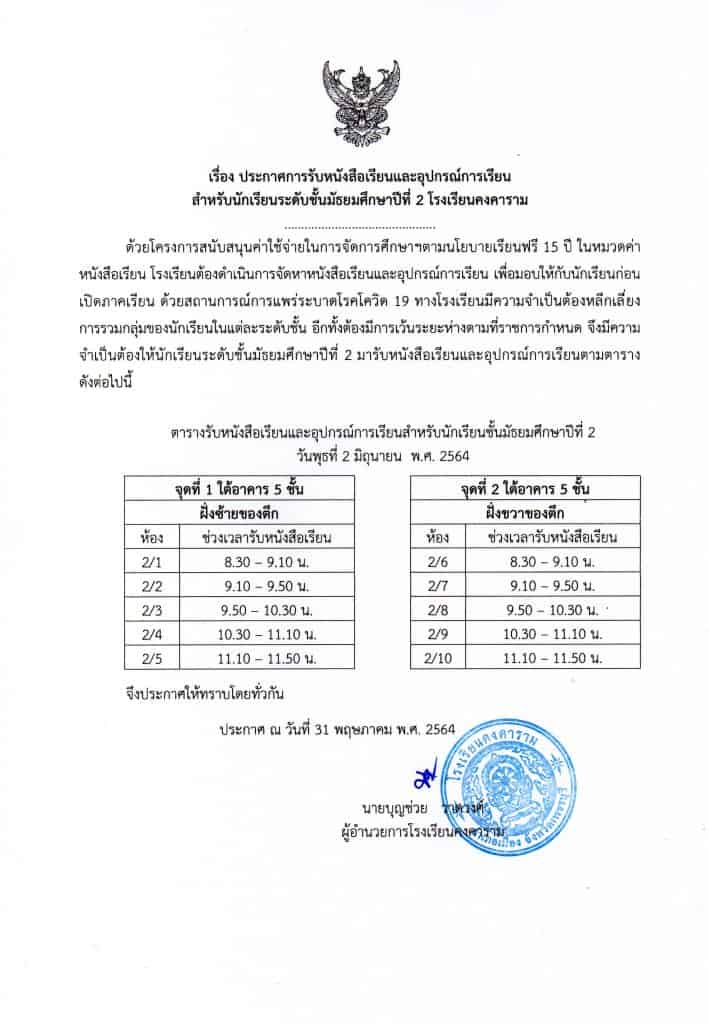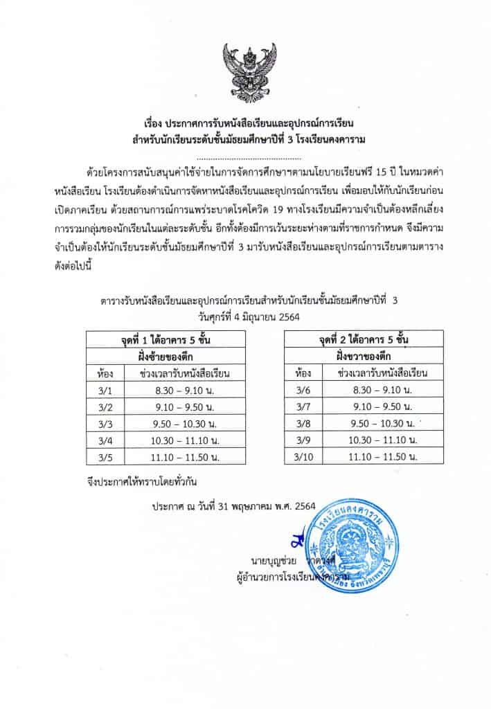ด้วยโครงการสนับสนุนค่าใช้จ่ายในการจัดการศึกษาฯตามนโยบายเรียนฟรี 15 ปี ในหมวดค่าหนังสือเรียน โรงเรียนต้องดำเนินการจัดหาหนังสือเรียนและอุปกรณ์การเรียน เพื่อมอบให้กับนักเรียนก่อนเปิดภาคเรียน ด้วยสถานการณ์การแพร่ระบาดโรคโควิต 19 ทางโรงเรียนมีความจำเป็นต้องหลีกเลี่ยง การรวมกลุ่มของนักเรียนในแต่ละระดับชั้น อีกทั้งต้องมีการเว้นระยะห่างตามที่ราชการกำหนด จึงมีความจำเป็นต้องให้นักเรียนมารับหนังสือเรียนและอุปกรณ์การเรียนตามตาราง ตามประกาศ