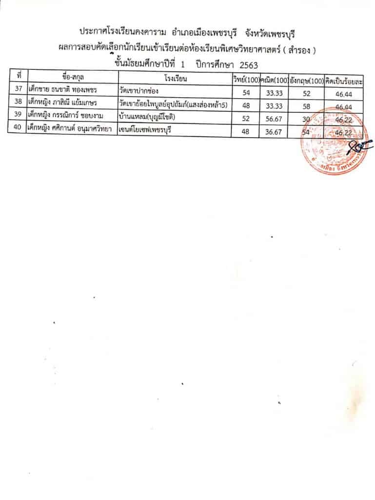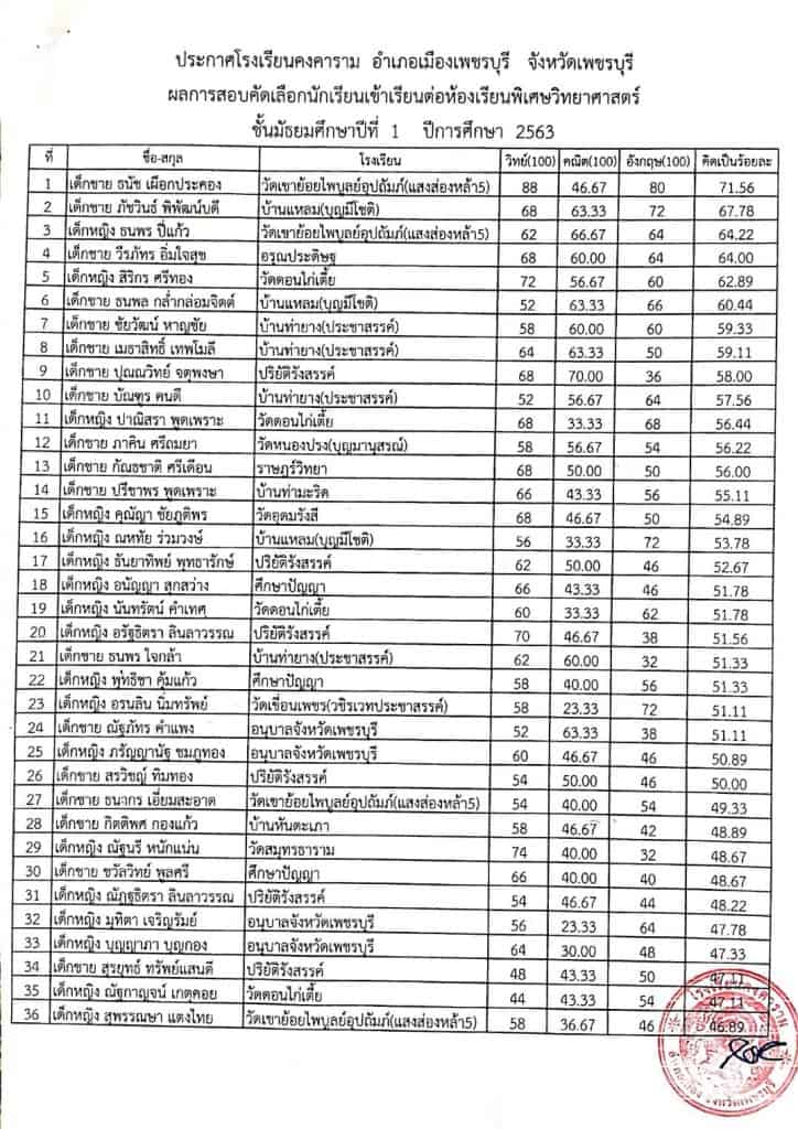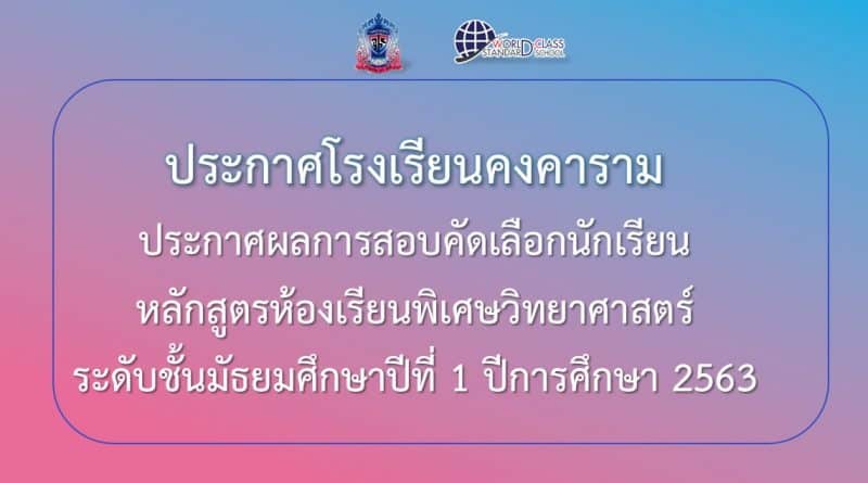 ประกาศผลการสอบคัดเลือก หลักสูตรห้องเรียนพิเศษวิทยาศาสตร์ ม.1 ปีการศึกษา2563