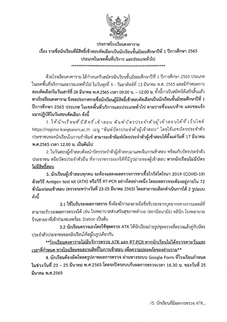**โรงเรียนคงคารามไม่มีบริการตรวจ ATK และ RT-PCR หากนักเรียนไม่ได้ตรวจตามวันและเวลาที่กำหนด ทางโรงเรียนขอสงวนสิทธิ์ในการเข้าสอบ เพื่อความปลอดภัยของส่วนรวม**