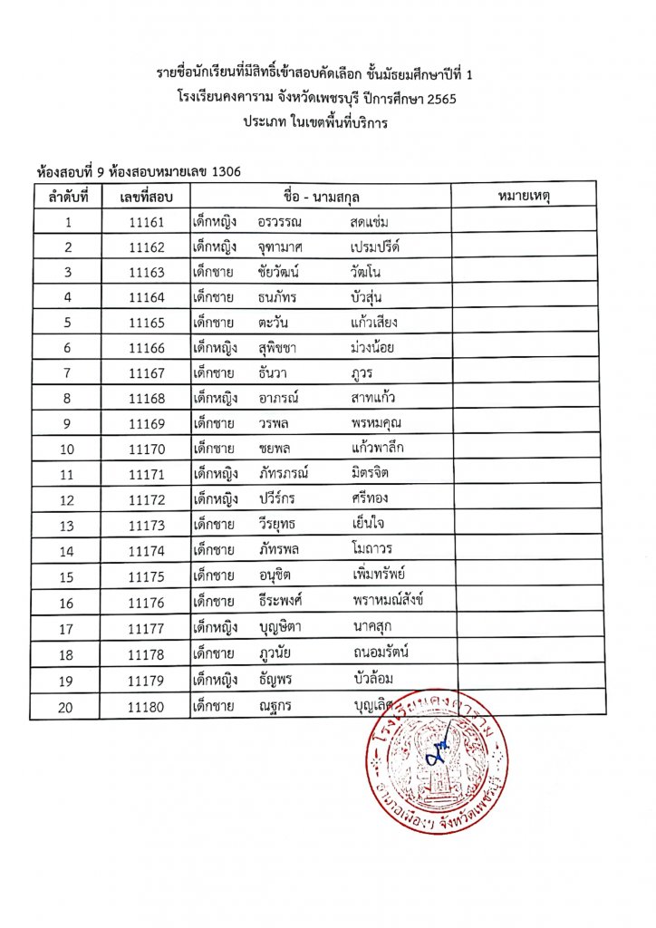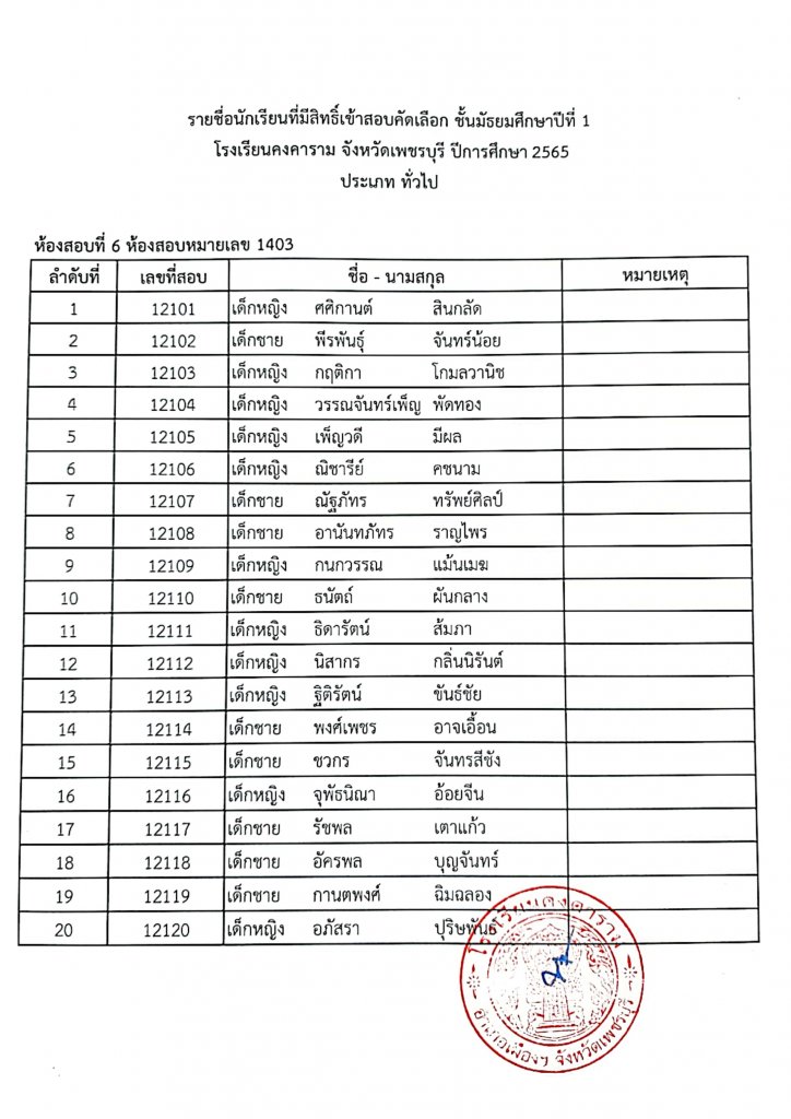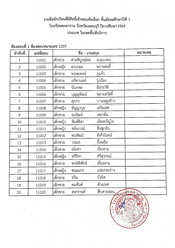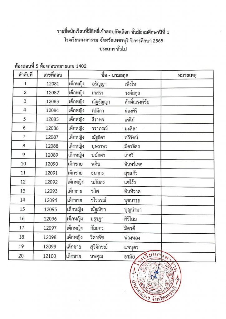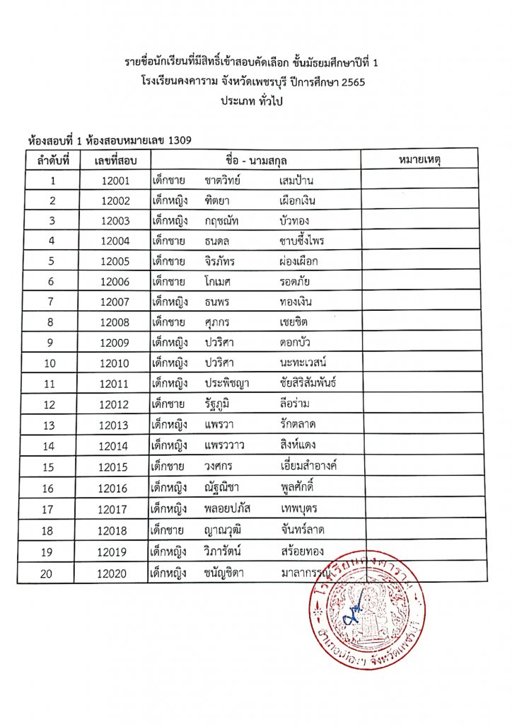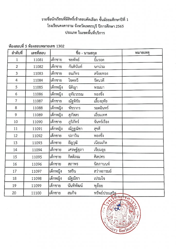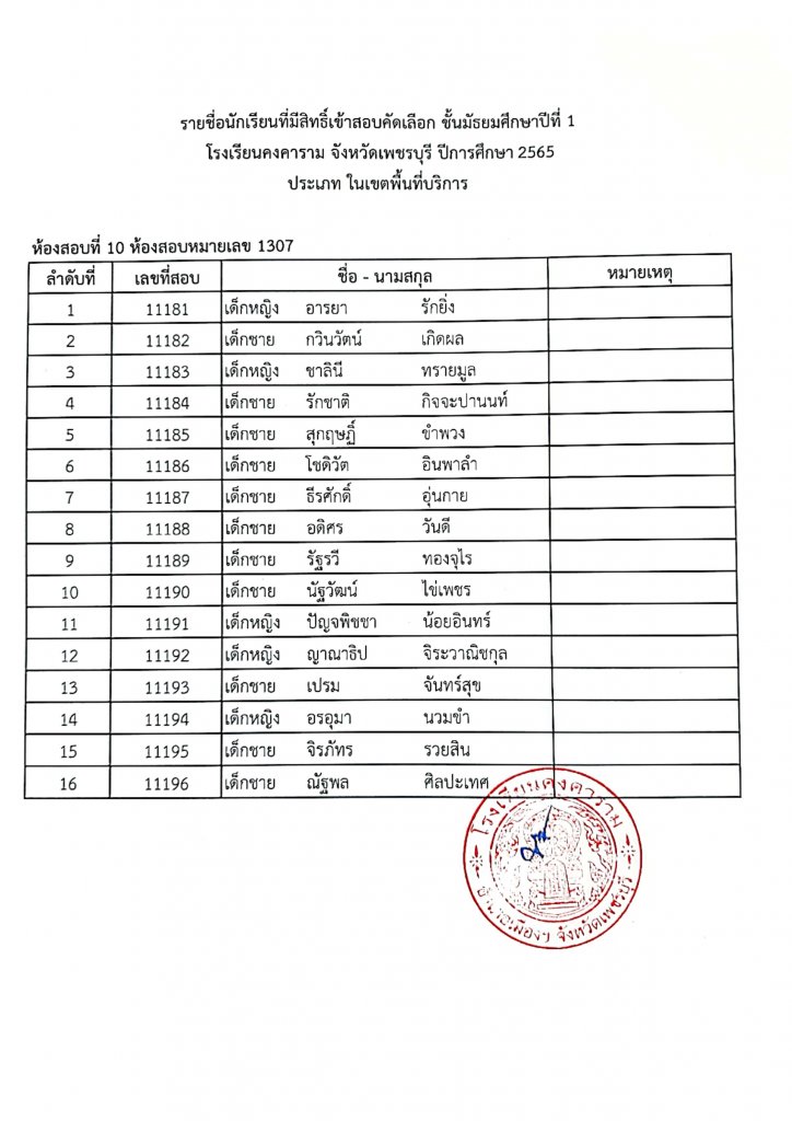 ประกาศรายชื่อเข้าสอบ ม.1 ปีการศึกษา 2565