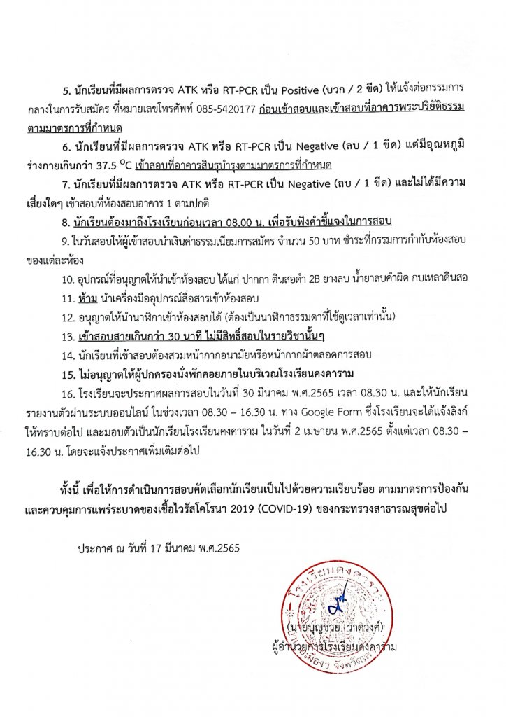 5. นักเรียนที่มีผลการตรวจ ATK หรือ RT-PCR เป็น Positive (บวก / 2 ขีด) ให้แจ้งต่อกรรมการกลางในการรับสมัคร ที่หมายเลขโทรศัพท์ 085-5420177 ก่อนเข้าสอบและเข้าสอบที่อาคารพระปริยัติธรรมตามมาตรการที่กำหนด