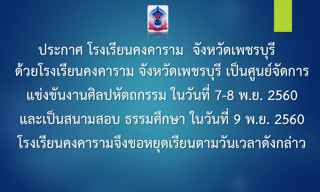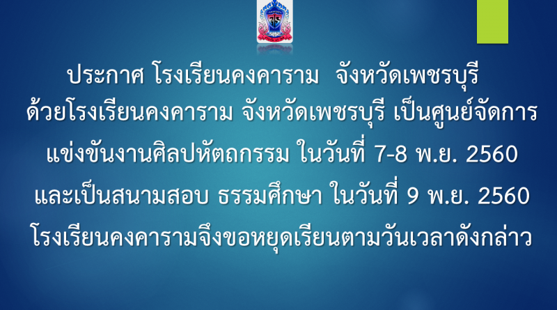 ด้วยโรงเรียนคงคาราม จังหวัดเพชรบุรี เป็นศูนย์จัดการแข่งขันงานศิลปหัตถกรรมนักเรียน ครั้งที่ 67  ในวันที่ 7-8  พฤศจิกายน 2560 และเป็นสนามสอบ ธรรมศึกษา ในวันที่ 9 พฤศจิกายน 2560 โรงเรียนคงคาราม จึงขอหยุดเรียนตามวันเวลาดังกล่าว