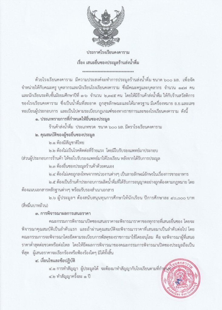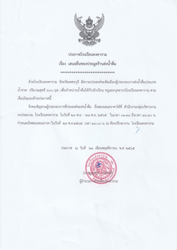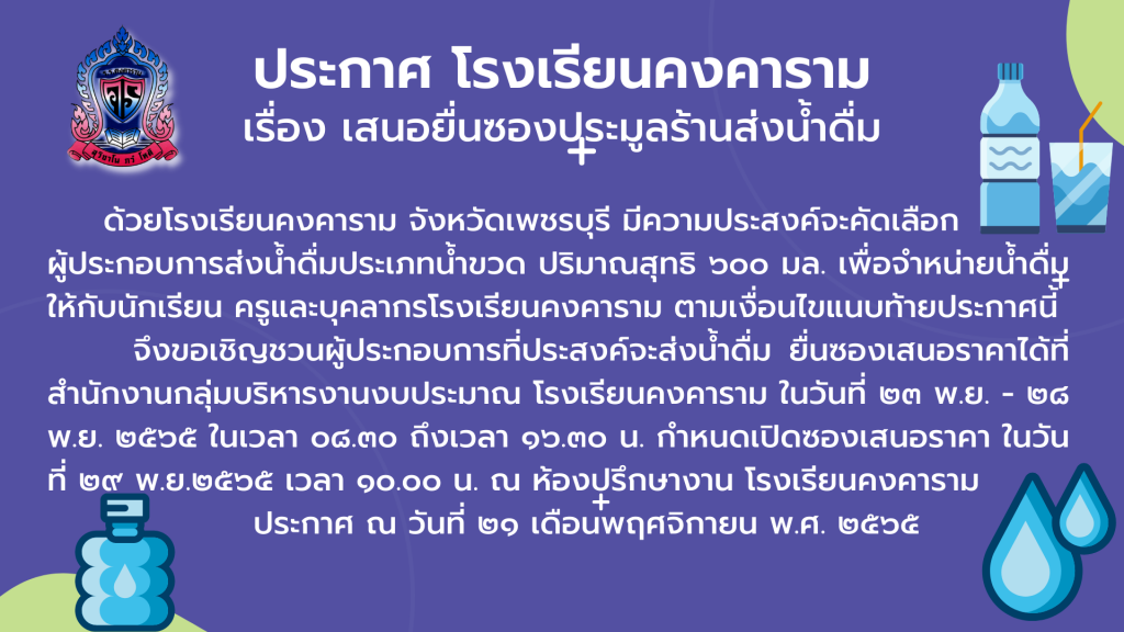 ด้วยโรงเรียนคงคาราม จังหวัดเพชรบุรี มีความประสงค์จะคัดเลือกผู้ประกอบการส่งน้ำดื่มประเภท
