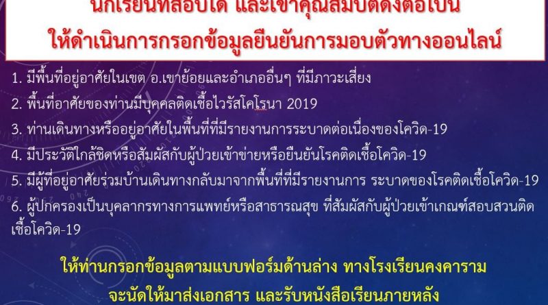 ด้วยโรงเรียนคงคาราม กำหนดมอบตัวนักเรียนชั้นม.1 วันเสาร์ที่ 29 พฤษภาคม 2564 กลุ่มที่ 1-5 เวลา 08.00 น. -11.30 น. และกลุ่มที่ 6-10 เวลา 13.00 – 16.30 น. นักเรียนชั้นม.4 วันอาทิตย์ที่ 30 พฤษภาคม 2564 เวลา 08.00 – 12.00 น. แต่ด้วยสถานการณ์การแพร่ระบาดของเชื้อไวรัสโคโรนา 2019 (COVID-19) ระลอกใหม่ ตามประกาศกระทรวงสาธารณสุข โรงเรียนคงคารามคำนึงถึงความปลอดภัยของนักเรียน ตลอดจนผู้ปกครองและผู้มีส่วนเกี่ยวข้อง จึงกำหนดมาตรการโดยมีแนวปฏิบัติดังนี้