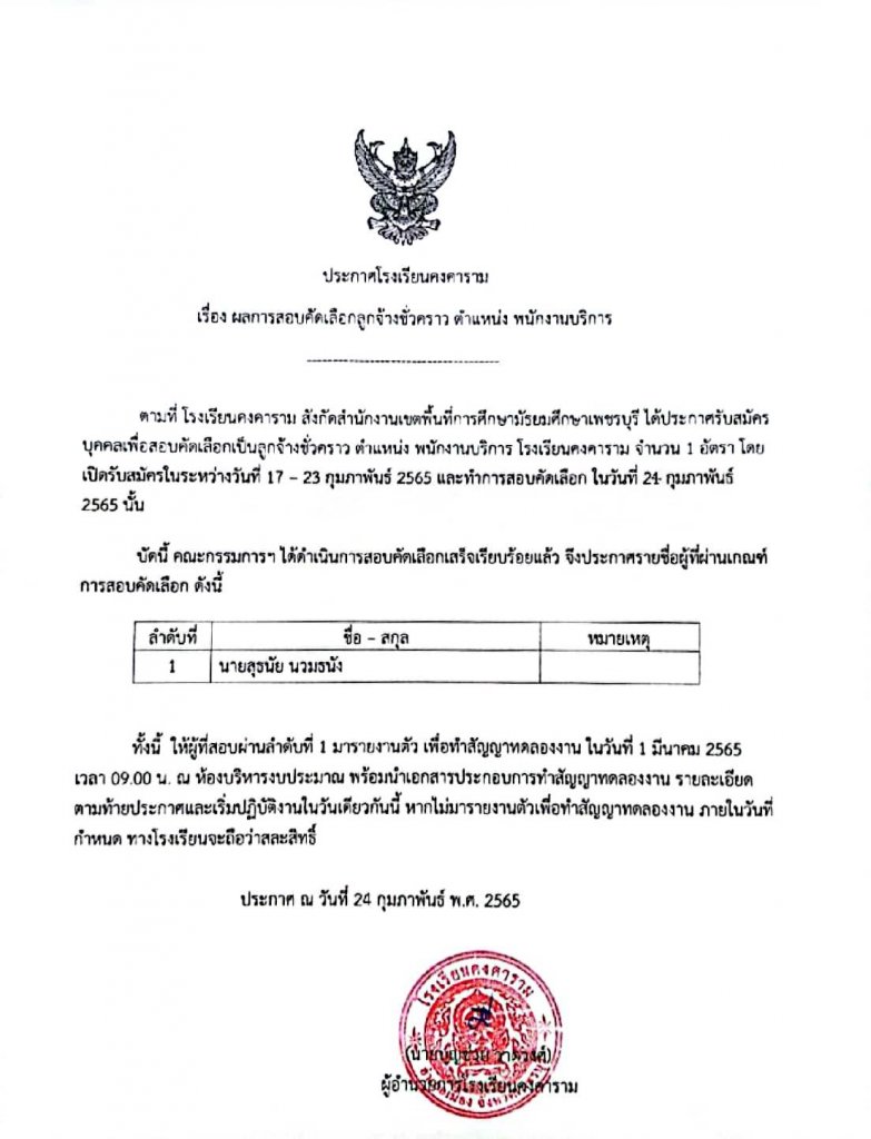 เรื่อง ผลการสอบคัดเลือกลูกจ้างชั่วคราว ตำแหน่ง พนักงานบริการ