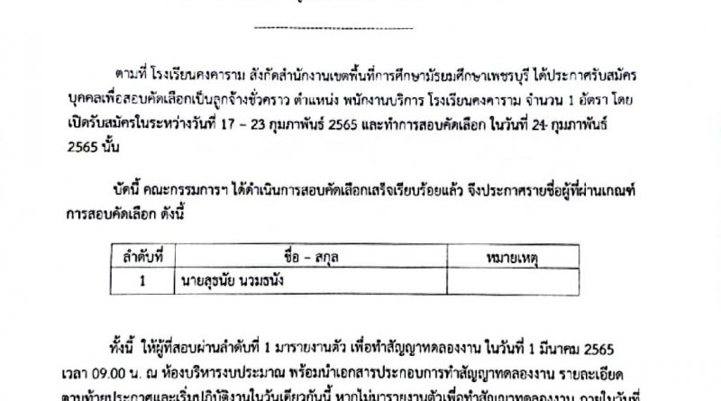 ผลการสอบคัดเลือกลูกจ้างชั่วคราว ตำแหน่ง พนักงานบริการ