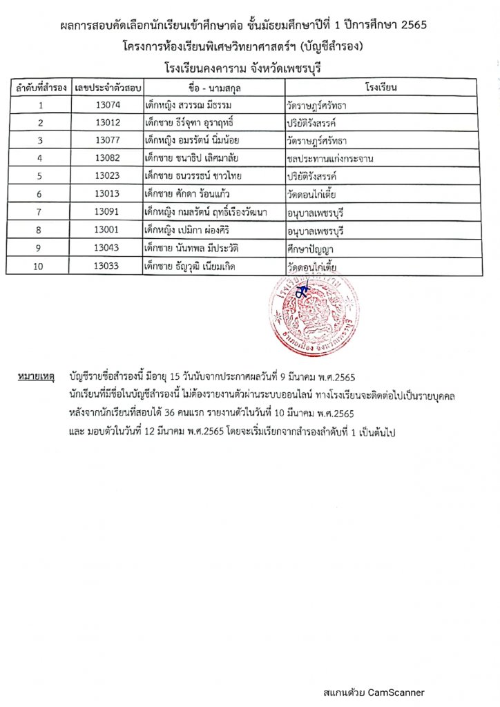 ตามที่โรงเรียนคงคาราม ได้ประกาศรับนักเรียนเข้าศึกษาต่อระดับชั้นมัธยมศึกษาปีที่ 1 โครงการห้องเรียนพิเศษวิทยาศาสตร์ฯ ปีการศึกษา 2565 เพื่อให้นักเรียนได้รับการพัฒนาอย่างเต็มศักยภาพ เป็นพื้นฐานในการศึกษาต่อในระดับที่สูงขึ้น มีความสามารถในการแข่งขันระดับสากล โดยได้ดำเนินการสอบเมื่อวันที่ 6 มีนาคม พ.ศ. 2565 ไปแล้วนั้น บัดนี้ โรงเรียนคงคารามได้พิจารณาตรวจผลการสอบคัดเลือกเรียบร้อยแล้ว จำนวน 36 คน ดังรายชื่อแนบท้ายประกาศนี้