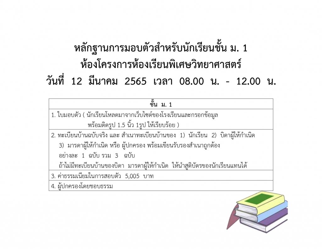8. ค่าธรรมเนียมจำนวน 5,005 บาท (ค่าธรรมเนียมในการมอบตัว 3,005 บาท และค่าพัฒนาศักยภาพนักเรียนห้องโครงการวิทยาศาสตร์ 2,000 บาท)