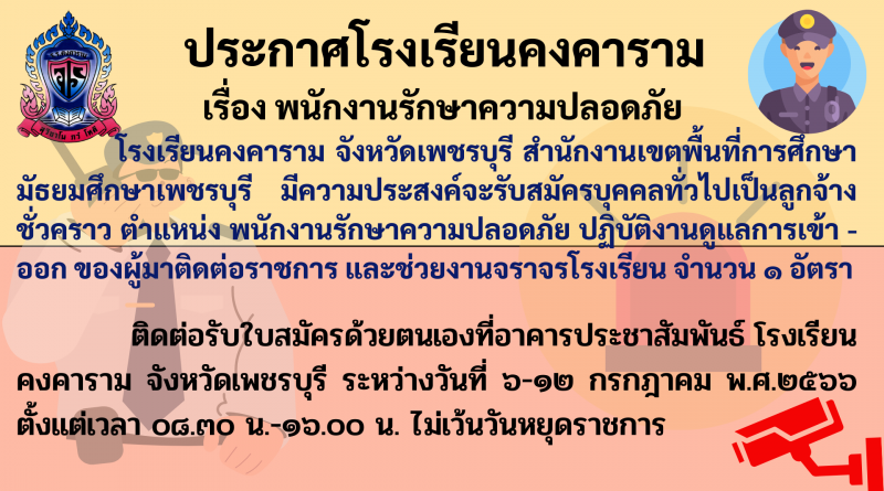โรงเรียนคงคาราม จังหวัดเพชรบุรี สำนักงานเขตพื้นที่การศึกษามัธยมศึกษาเพชรบุรี มีความประสงค์จะรับสมัครบุคคลทั่วไปเป็นลูกจ้างชั่วคราว ตำแหน่ง พนักงานรักษาความปลอดภัย ปฏิบัติงานดูแลการเข้า – ออก ของผู้มาติดต่อราชการ และช่วยงานจราจรโรงเรียน จำนวน ๑ อัตรา