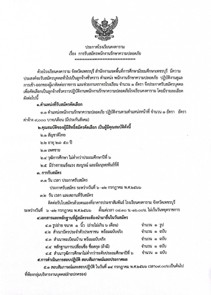 โรงเรียนคงคาราม จังหวัดเพชรบุรี สำนักงานเขตพื้นที่การศึกษามัธยมศึกษาเพชรบุรี มีความประสงค์จะรับสมัครบุคคลทั่วไปเป็นลูกจ้างชั่วคราว ตำแหน่ง พนักงานรักษาความปลอดภัย ปฏิบัติงานดูแลการเข้า – ออก ของผู้มาติดต่อราชการ และช่วยงานจราจรโรงเรียน จำนวน ๑ อัตรา