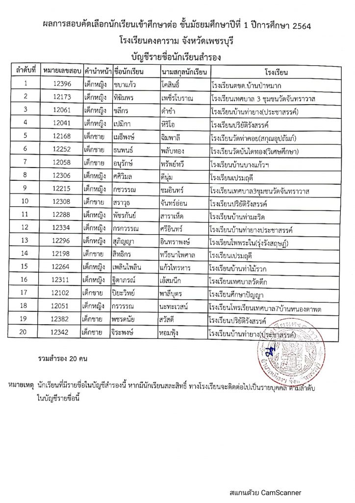 ในการนี้โรงเรียนคงคารามได้ประกาศ นักเรียนที่สอบติดสำรอง จำนวน 20 คน ดังรายชื่อแนบท้ายประกาศนี้ สำหรับนักเรียนที่สอบติดสำรอง ถ้ามีนักเรียนตัวจริงสละสิทธิ์ ทางโรงเรียนจะติดต่อกลับไปเป็นรายบุคคลตามลำดับ