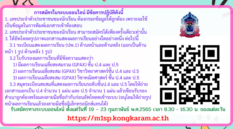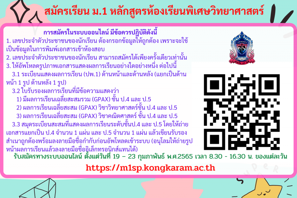 รับสมัครนักเรียน ม.1 หลักสูตรห้องเรียนพิเศษวิทยาศาสตร์ทางระบบออนไลน์ ตั้งแต่วันที่ 19 – 23 กุมภาพันธ์ พ.ศ.2565 เวลา 8.30 – 16.30 น. ของแต่ละวัน พิมพ์เอกสารบัตรเข้าห้องสอบตั้งแต่วันที่ 26 กุมภาพันธ์ พ.ศ.2565 เป็นต้นไป  สามารถศึกษารายละเอียดและสมัครได้ที่ลิงค์ : https://m1sp.kongkaram.ac.th/