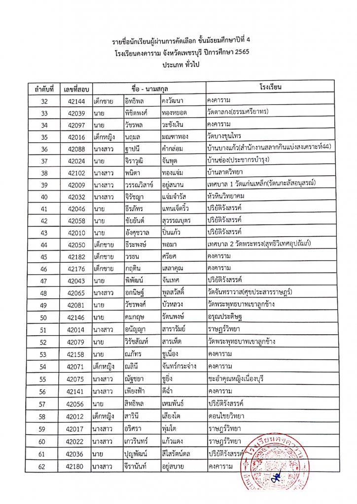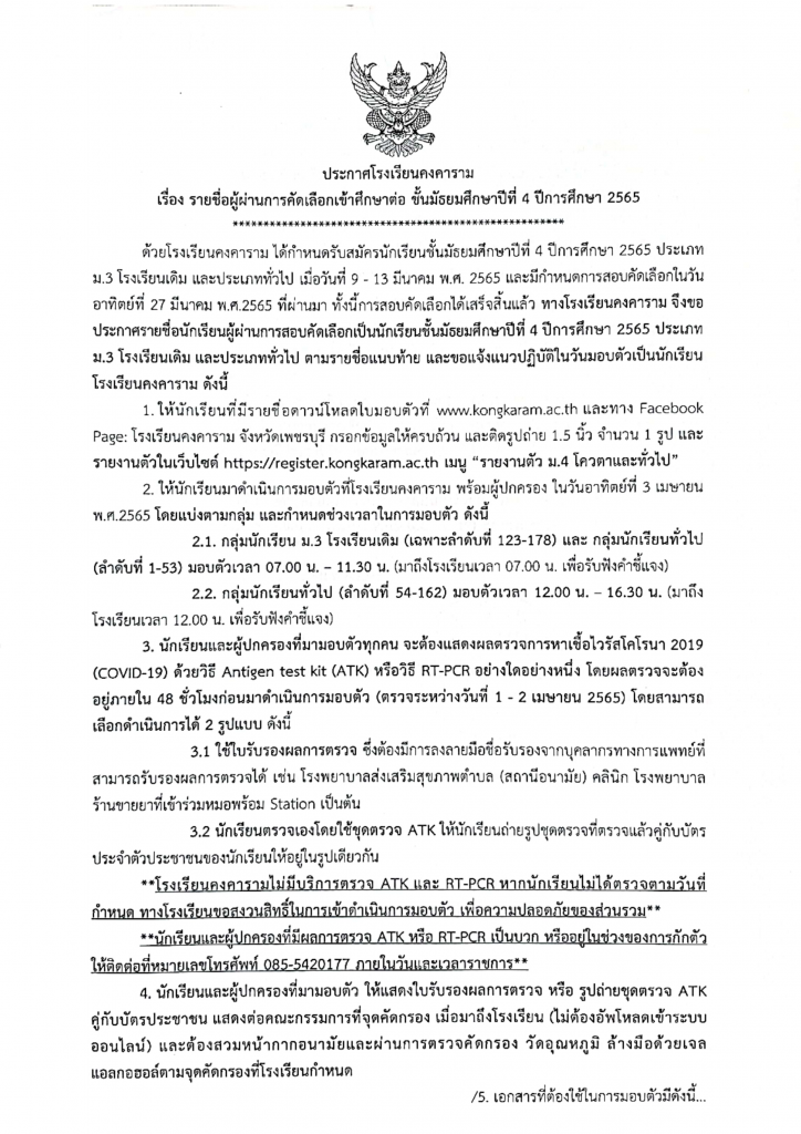 ด้วยโรงเรียนคงคาราม ได้กำหนดรับสมัครนักเรียนชั้นมัธยมศึกษาปีที่ 4 ปีการศึกษา 2565 ประเภท ม.3 โรงเรียนเดิม และประเภททั่วไป เมื่อวันที่ 9 – 13 มีนาคม พ.ศ. 2565 และมีกำหนดการสอบคัดเลือกในวันอาทิตย์ที่ 27 มีนาคม พ.ศ.2565 ที่ผ่านมา ทั้งนี้การสอบคัดเลือกได้เสร็จสิ้นแล้ว ทางโรงเรียนคงคาราม จึงขอประกาศรายชื่อนักเรียนผู้ผ่านการสอบคัดเลือกเป็นนักเรียนชั้นมัธยมศึกษาปีที่ 4 ปีการศึกษา 2565 ประเภท ม.3 โรงเรียนเดิม และประเภททั่วไป ตามรายชื่อแนบท้าย และขอแจ้งแนวปฏิบัติในวันมอบตัวเป็นนักเรียนโรงเรียนคงคาราม ดังนี้