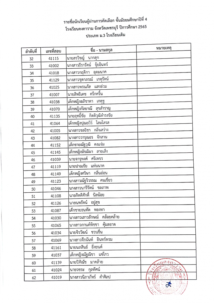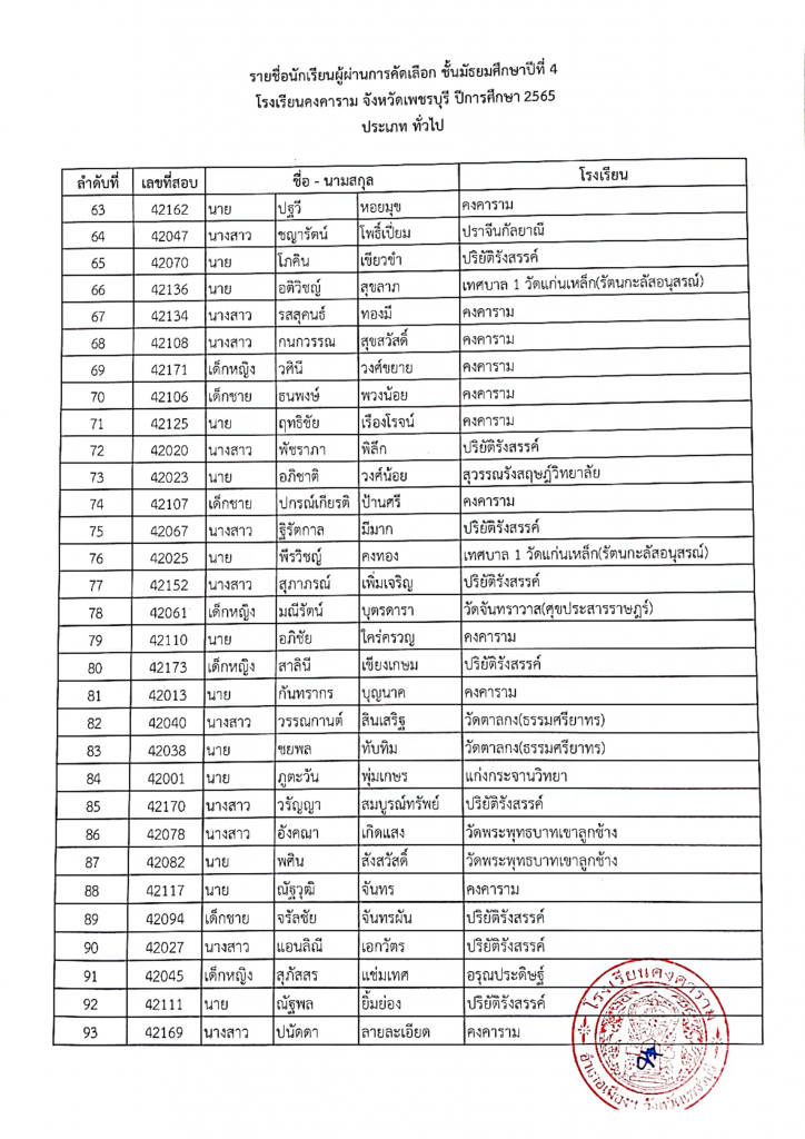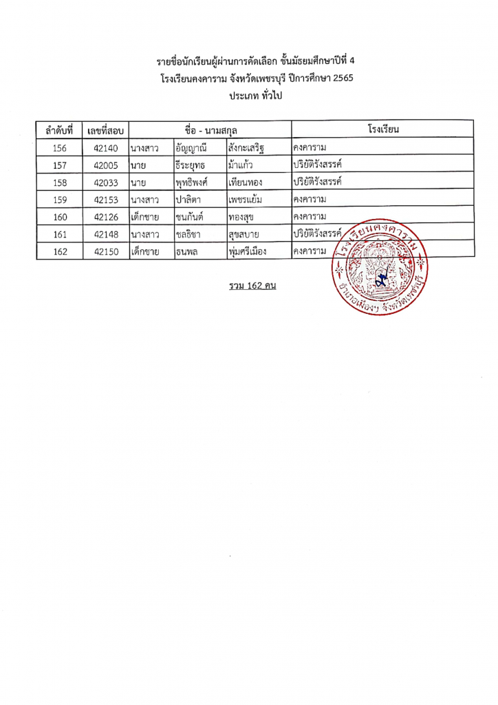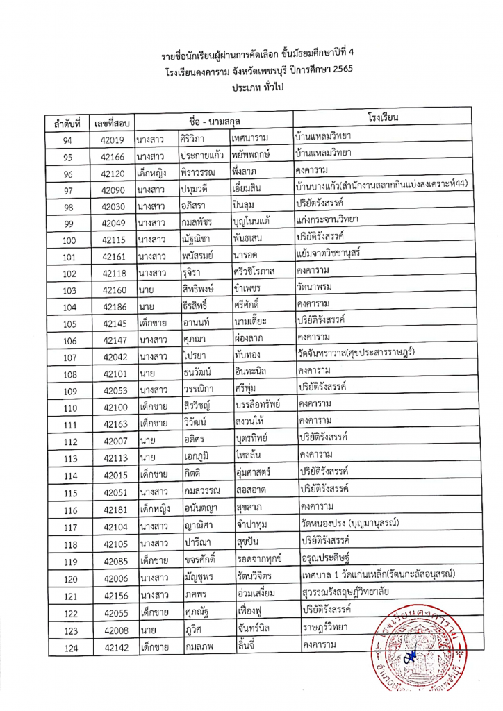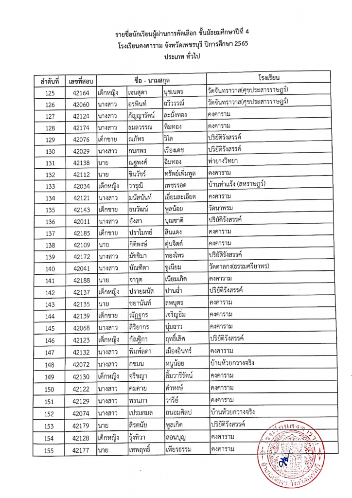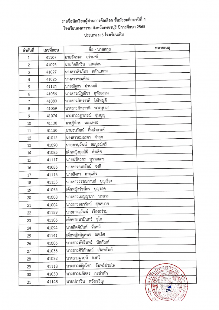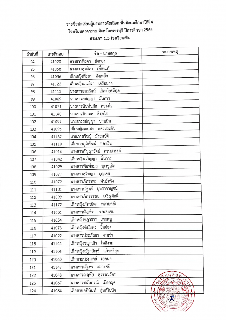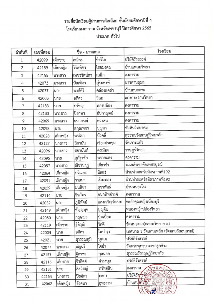 รายชื่อผู้ผ่านการคัดเลือก ม. 4 ปีการศึกษา 2565