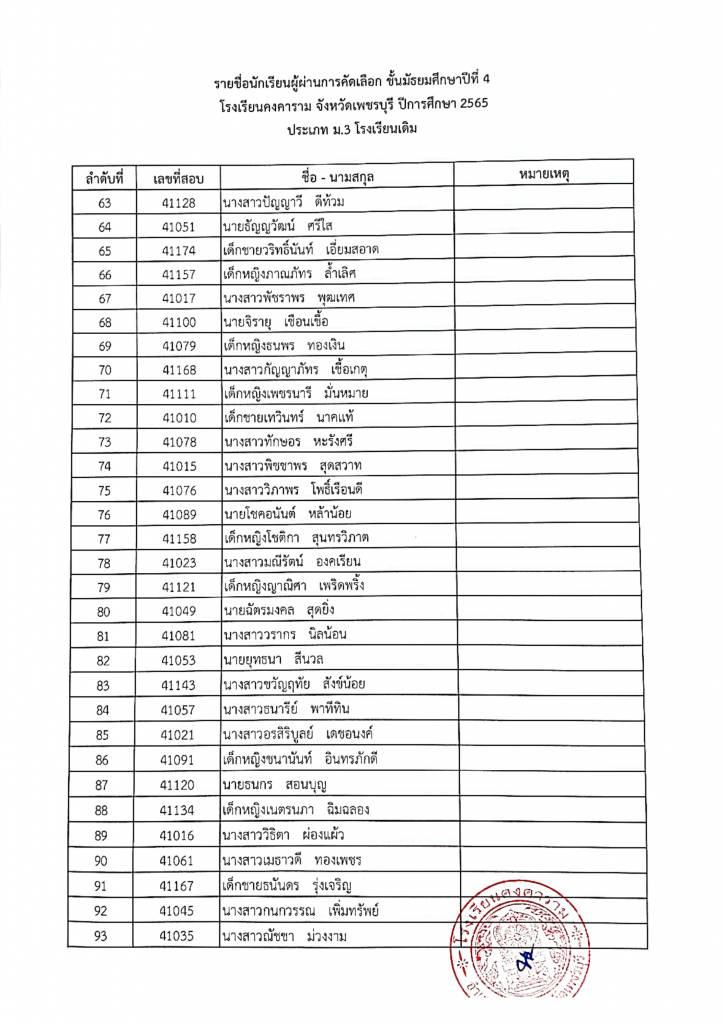 เรื่อง รายชื่อผู้ผ่านการคัดเลือกเข้าศึกษาต่อ ชั้นมัธยมศึกษาปีที่ 4 ปีการศึกษา 2565