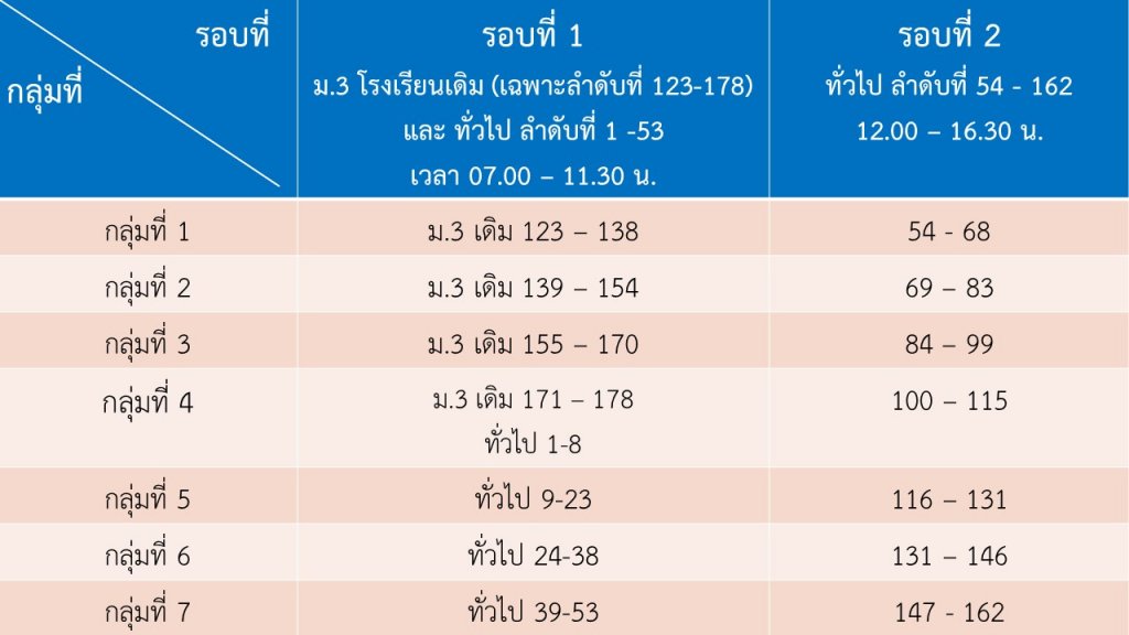 2.1. กลุ่มนักเรียน ม.3 โรงเรียนเดิม (เฉพาะลำดับที่ 123-178) และ กลุ่มนักเรียนทั่วไป (ลำดับที่ 1-53) มอบตัวเวลา 07.00 น. – 11.30 น. (มาถึงโรงเรียนเวลา 07.00 น. เพื่อรับฟังคำชี้แจง)
