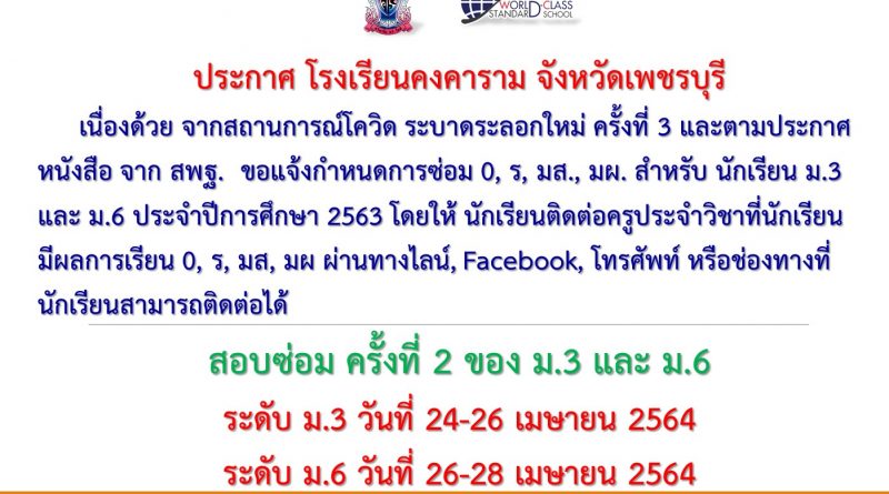 เนื่องด้วย จากสถานการณ์โควิด ระบาดระลอกใหม่ ครั้งที่ 3 และตามประกาศหนังสือ จาก สพฐ. ขอแจ้งกำหนดการซ่อม 0, ร, มส., มผ. สำหรับ นักเรียน ม.3 และ ม.6 ประจำปีการศึกษา 2563  โดยให้ นักเรียนติดต่อครูประจำวิชาที่นักเรียนมีผลการเรียน 0, ร, มส, มผ ผ่านทางไลน์, Facebook, โทรศัพท์ หรือช่องทางที่นักเรียนสามารถติดต่อได้