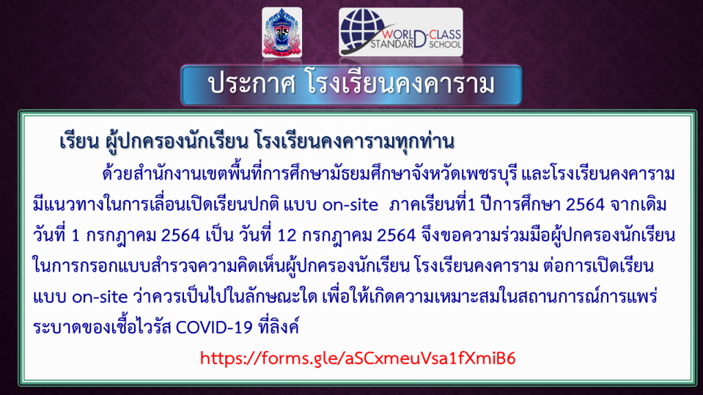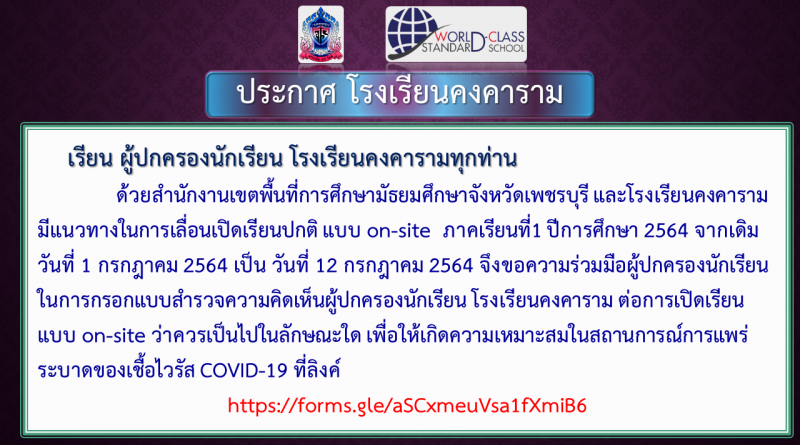 ด้วยสำนักงานเขตพื้นที่การศึกษามัธยมศึกษาจังหวัดเพชรบุรี และโรงเรียนคงคาราม มีแนวทางในการเลื่อนเปิดเรียนปกติ แบบ on-site ภาคเรียนที่1 ปีการศึกษา 2564 จากเดิมวันที่ 1 กรกฎาคม 2564 เป็น วันที่ 12 กรกฎาคม 2564 จึงขอความร่วมมือผู้ปกครองนักเรียน ในการกรอกแบบสำรวจความคิดเห็นผู้ปกครองนักเรียน โรงเรียนคงคาราม ต่อการเปิดเรียนแบบ on-site ว่าควรเป็นไปในลักษณะใด เพื่อให้เกิดความเหมาะสมในสถานการณ์การแพร่ระบาดของเชื้อไวรัส COVID-19 ที่ลิงค์