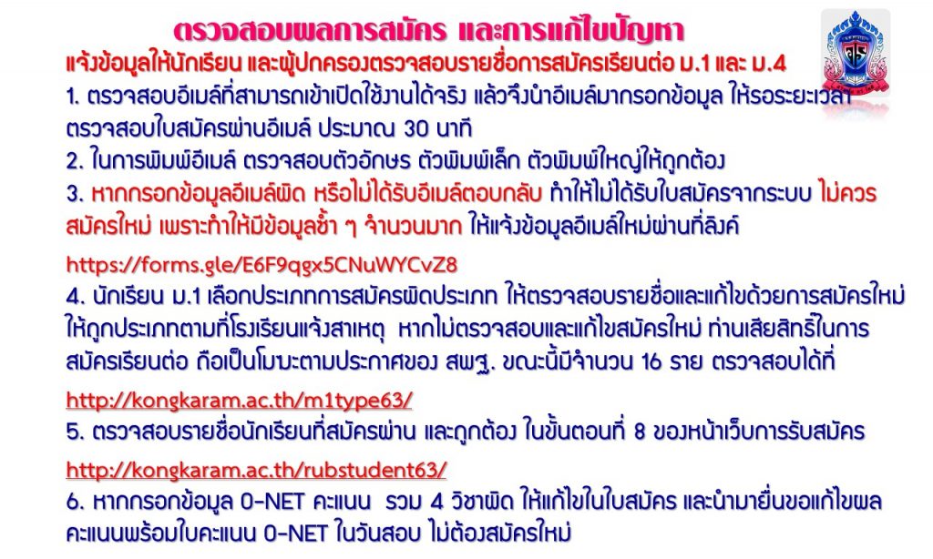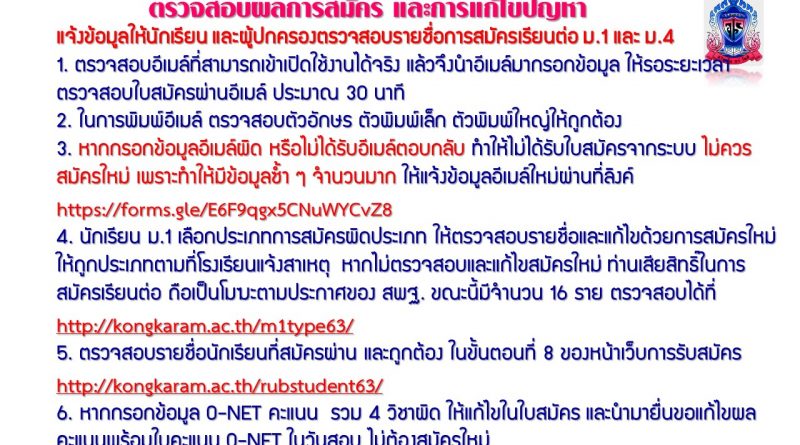 4. นักเรียน ม.1 เลือกประเภทการสมัครผิดประเภท ให้ตรวจสอบรายชื่อและแก้ไขด้วยการสมัครใหม่ให้ถูกประเภทตามที่โรงเรียนแจ้งสาเหตุ หากไม่ตรวจสอบและแก้ไขสมัครใหม่ ท่านเสียสิทธิ์ในการสมัครเรียนต่อ ถือเป็นโมฆะตามประกาศของ สพฐ. ขณะนี้มีจำนวน 16 ราย ตรวจสอบได้ที่ https://kongkaram.ac.th/m1type63/
