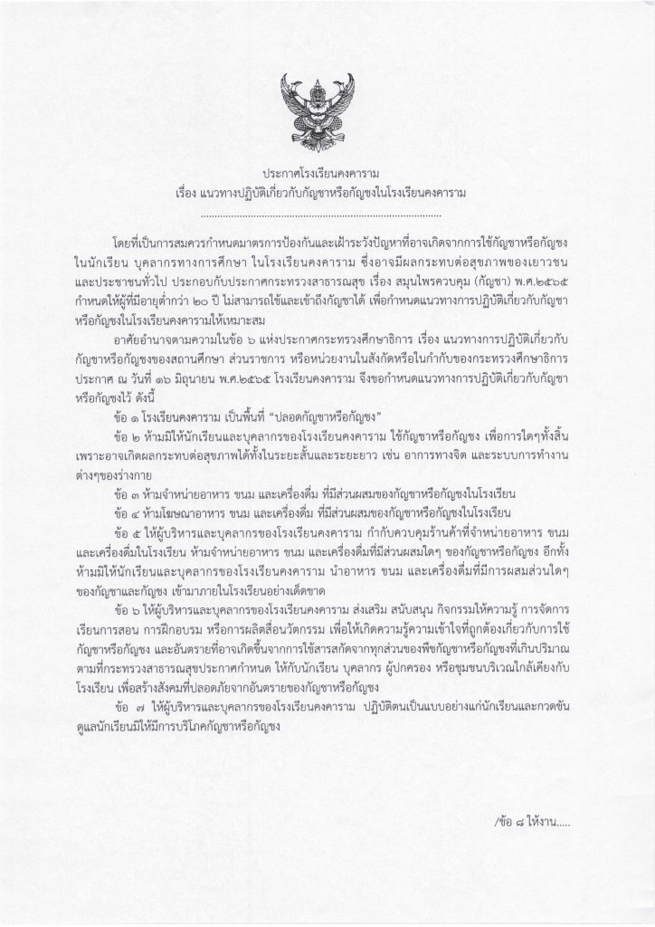 เรื่อง แนวทางปฎิบัติเกี่ยวกับกัญชาหรือกัญชงในโรงเรียนคงคาราม