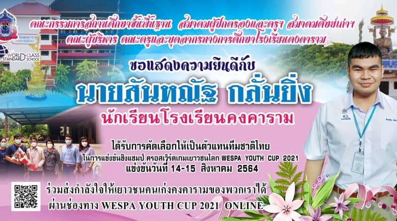 ผู้อำนวยการบุญช่วย วาดวงศ์และรองผู้อำนวยการ โรงเรียนคงคาราม ร่วมให้กำลังใจ นายสัณหณัฐ กลั่นยิ่ง นักเรียนชั้นม.5/5 นักเรียนโรงเรียนคงคาราม ที่ได้รับการคัดเลือกให้เป็นตัวแทนทีมชาติไทยในการแข่งขันชิงแชมป์คอร์ส Word เกมเยาวชนโลก WESPA YOUTH CUP 2021 แข่งขันในวันที่ 14 ถึง 15 สิงหาคม 2564 ร่วมส่งกำลังใจให้เยาวชนคนเก่งคงคาราม ผ่านทางช่อง WESPA YOUTH CUP 2021 Online : วันที่ 14 สิงหาคม 2564 ที่ผ่านมา