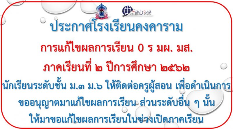 การขอแก้ไขผลการเรียน 0 ร มผ. มส. ภาคเรียนที่ ๒ ปีการศึกษา ๒๕๖๒ นักเรียนระดับชั้น ม.๓ และ ม.๖ ให้ติดต่อครูผู้สอน เพื่อดำเนินการขออนุญาตมาแก้ไขผลการเรียน ส่วนระดับ ม.๑ ม.๒ ม.๔ และ ม.๕ นั้น ให้มาขอแก้ไขผลการเรียนในช่วงเปิดภาคเรียน