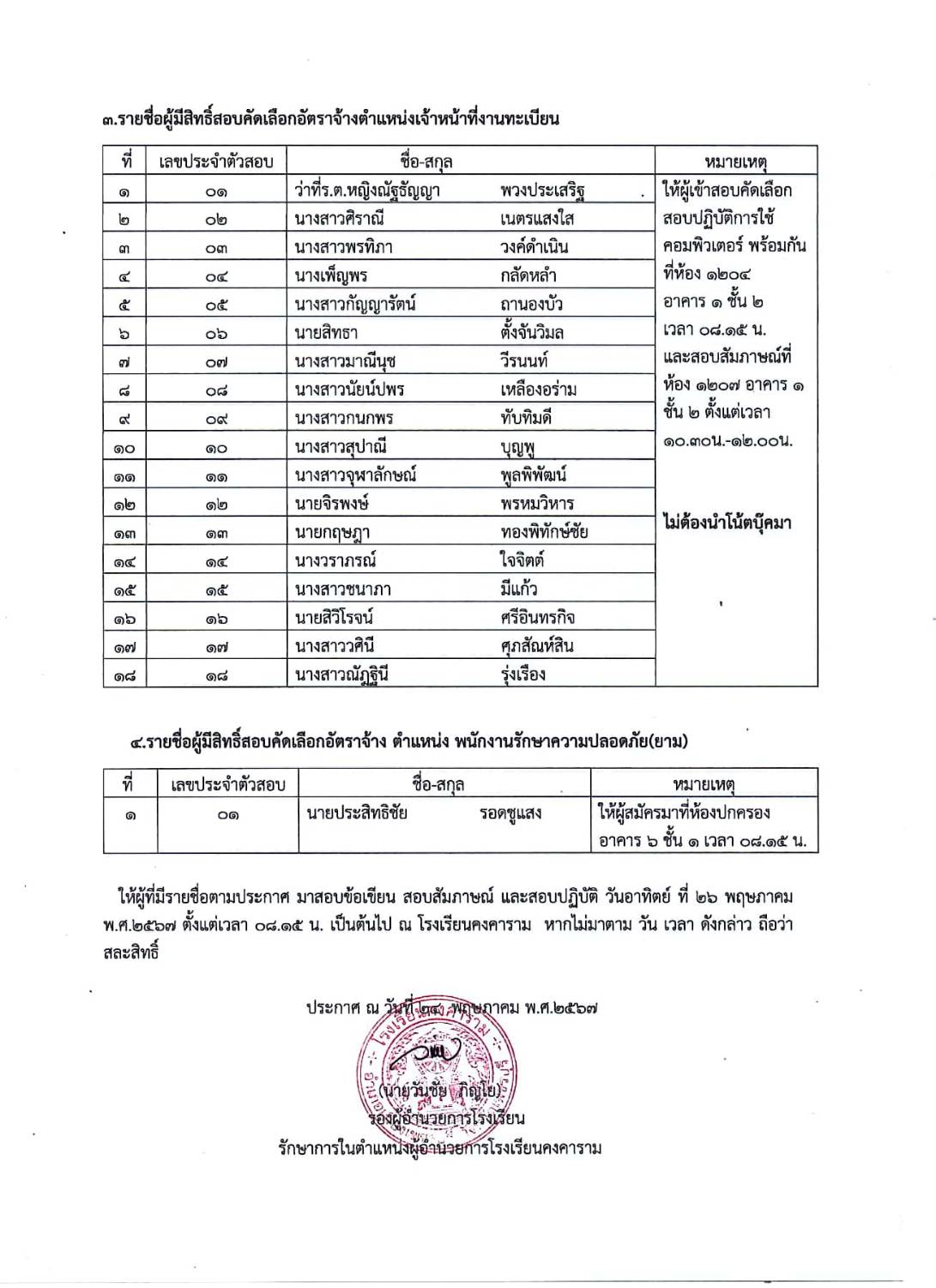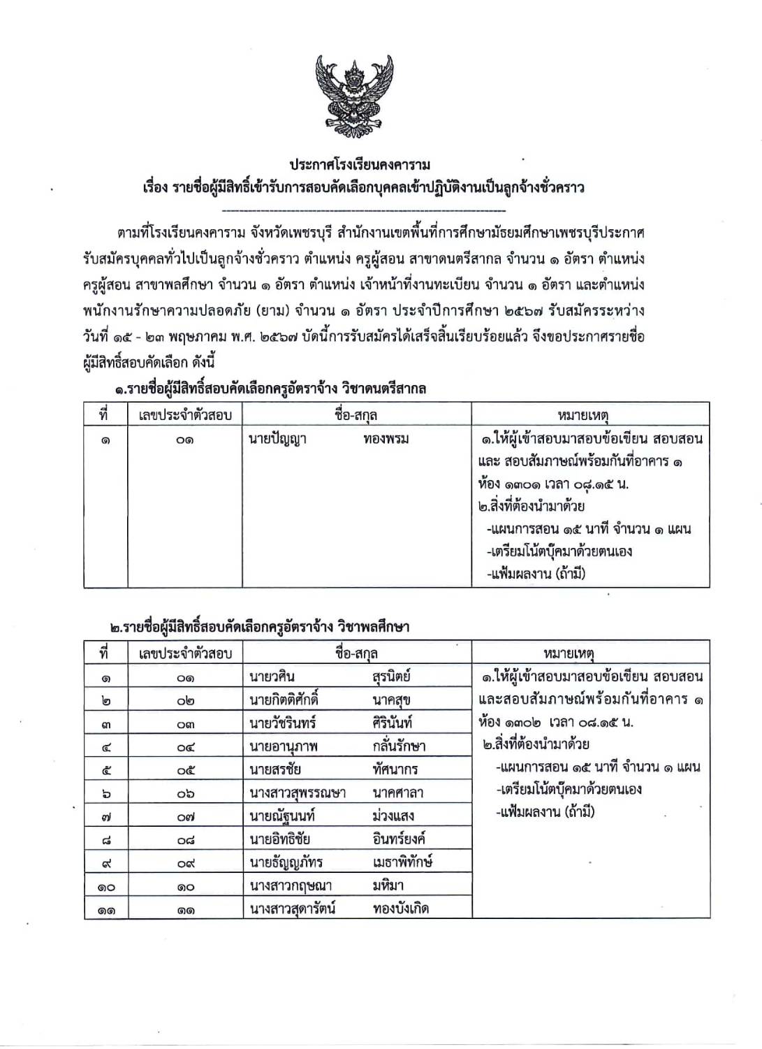 ประกาศ โรงเรียนคงคาราม เรื่อง รายชื่อผู้มีสิทธิ์เข้ารับการสอบคัดเลือกบุคคลเข้าปฏิบัติงานเป็นลูกจ้างชั่วคราว