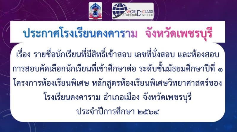 ประกาศรายชื่อนักเรียนที่มีสิทธิ์เข้าสอบ ม.1 หลักสูตรห้องเรียนพิเศษวิทยาศาสตร์