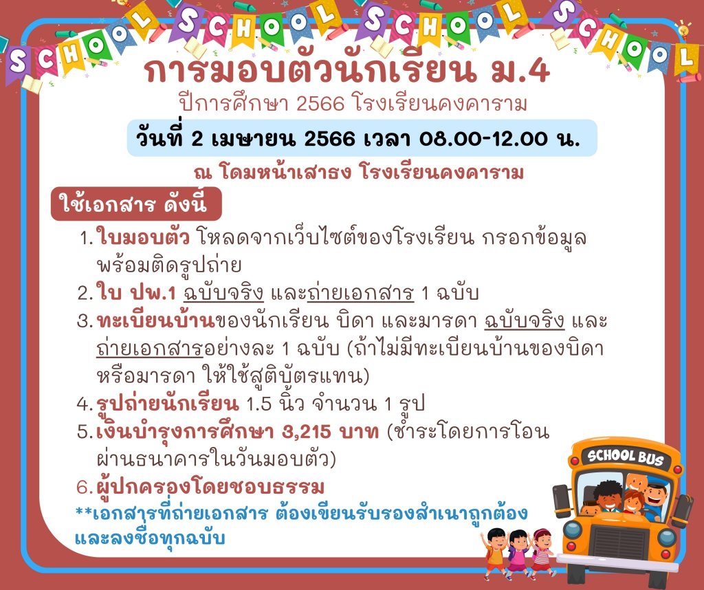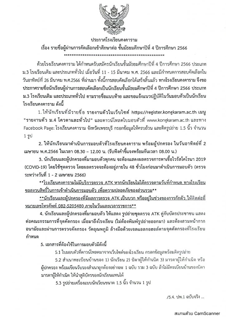 ด้วยโรงเรียนคงคาราม ได้กำหนดรับสมัครนักเรียนชั้นมัธยมศึกษาปีที่ 4 ปีการศึกษา 2566 ประเภท ม.3 โรงเรียนเดิม และประเภททั่วไป เมื่อวันที่ 11 – 15 มีนาคม พ.ศ. 2566 และมีกำหนดการสอบคัดเลือกในวันอาทิตย์ที่ 26 มีนาคม พ.ศ.2566 ที่ผ่านมา ทั้งนี้การสอบคัดเลือกได้เสร็จสิ้นแล้ว ทางโรงเรียนคงคาราม จึงขอประกาศรายชื่อนักเรียนผู้ผ่านการสอบคัดเลือกเป็นนักเรียนชั้นมัธยมศึกษาปีที่ 4 ปีการศึกษา 2566 ประเภท ม.3 โรงเรียนเดิม และประเภททั่วไป ตามรายชื่อแนบท้าย และขอแจ้งแนวปฏิบัติในวันมอบตัวเป็นนักเรียนโรงเรียนคงคาราม ดังนี้