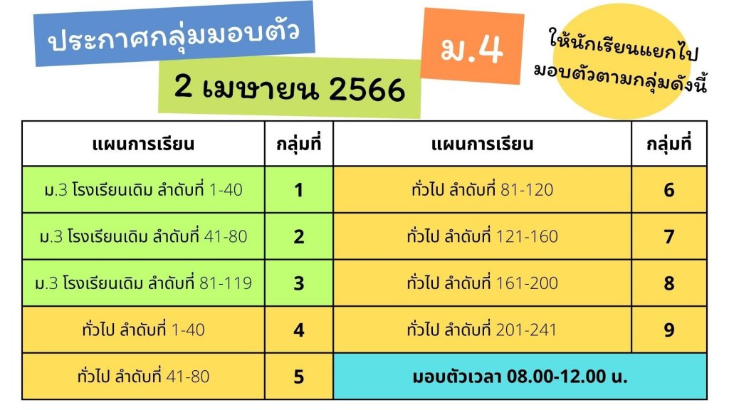 4. นักเรียนและผู้ปกครองที่มามอบตัว ให้แสดง รูปถ่ายชุดตรวจ ATK คู่กับบัตรประชาชน แสดงต่อคณะกรรมการที่จุดคัดกรอง เมื่อมาถึงโรงเรียน (ไม่ต้องพิมพ์รูปถ่ายออกมา) และต้องสวมหน้ากากอนามัยและผ่านการตรวจคัดกรอง วัดอุณหภูมิ ล้างมือด้วยเจลแอลกอฮอล์ตามจุดคัดกรองที่โรงเรียนกำหนด