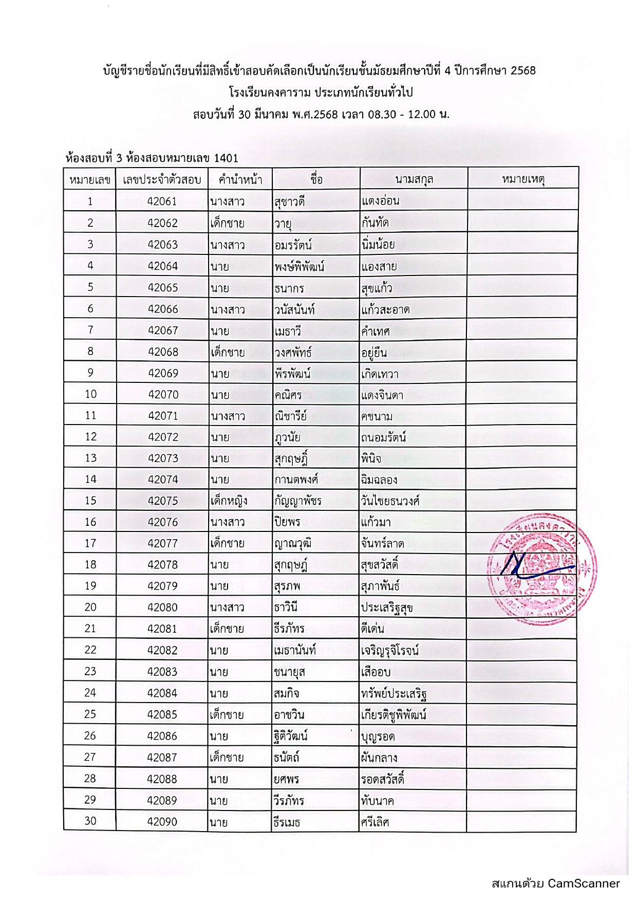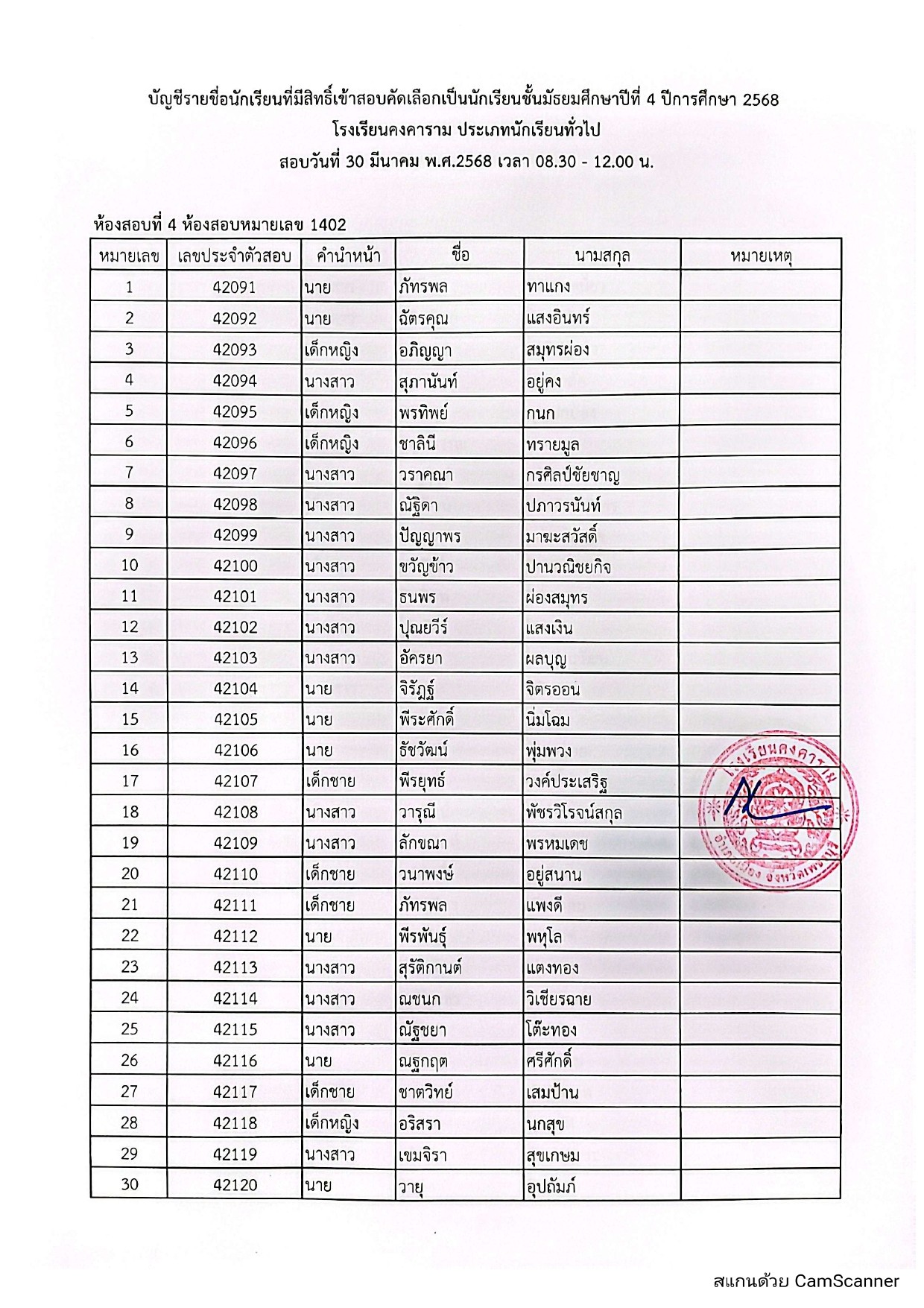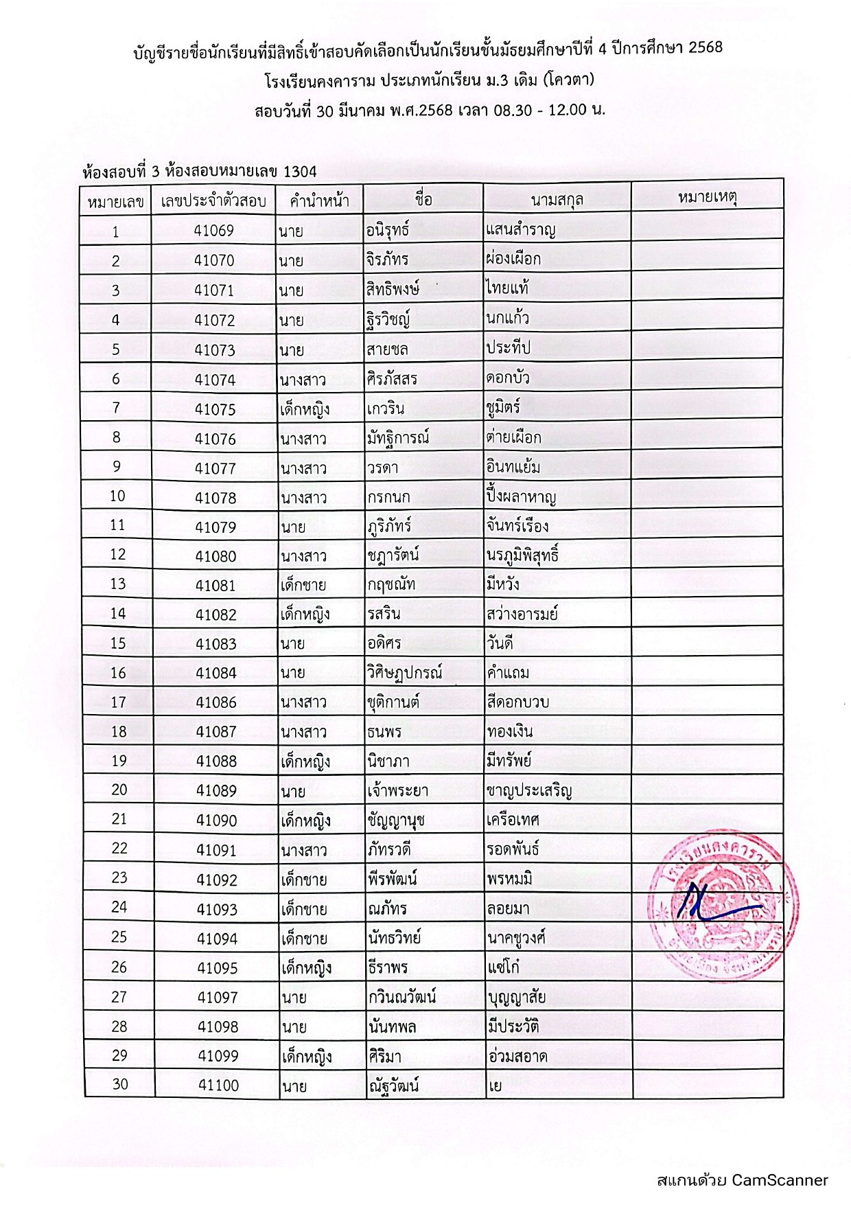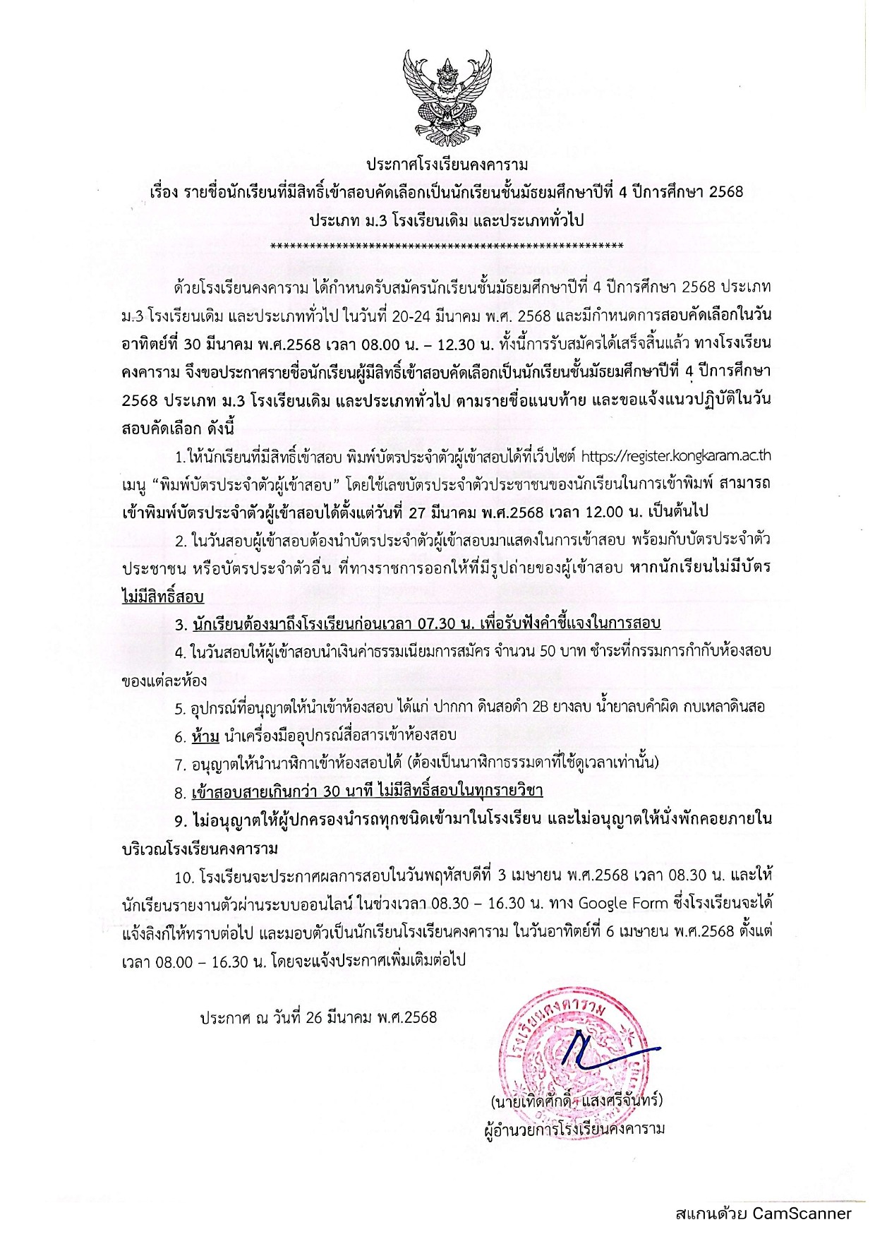 ประกาศรายชื่อนักเรียนที่มีสิทธิ์สอบคัดเลือกเข้าศึกษาต่อระดับชั้น ม.4 ปีการศึกษา 2568