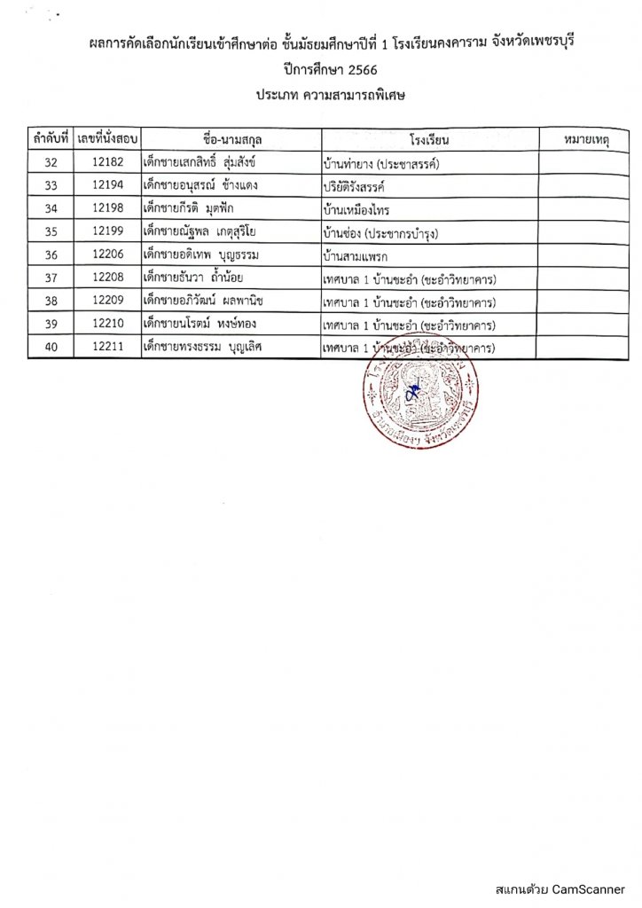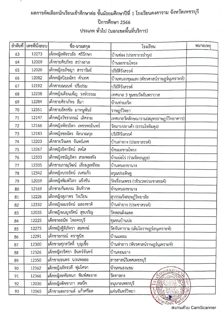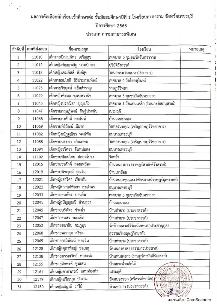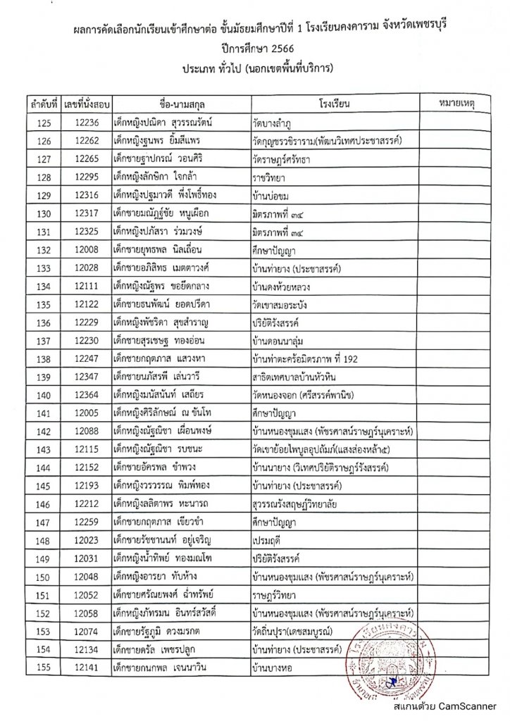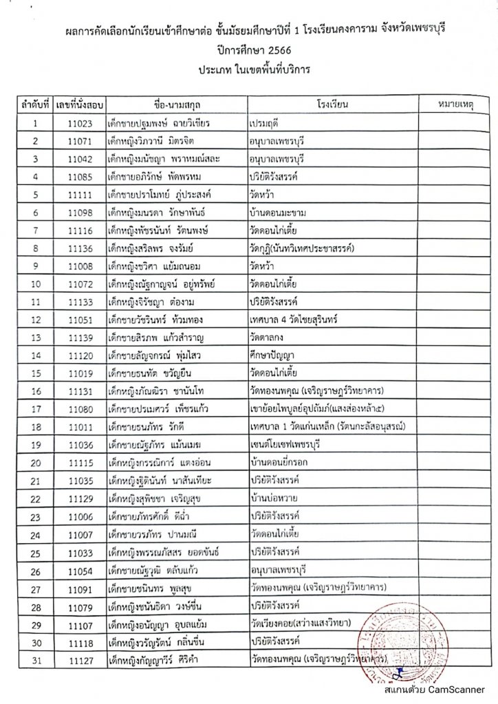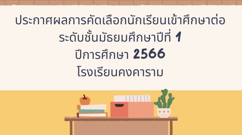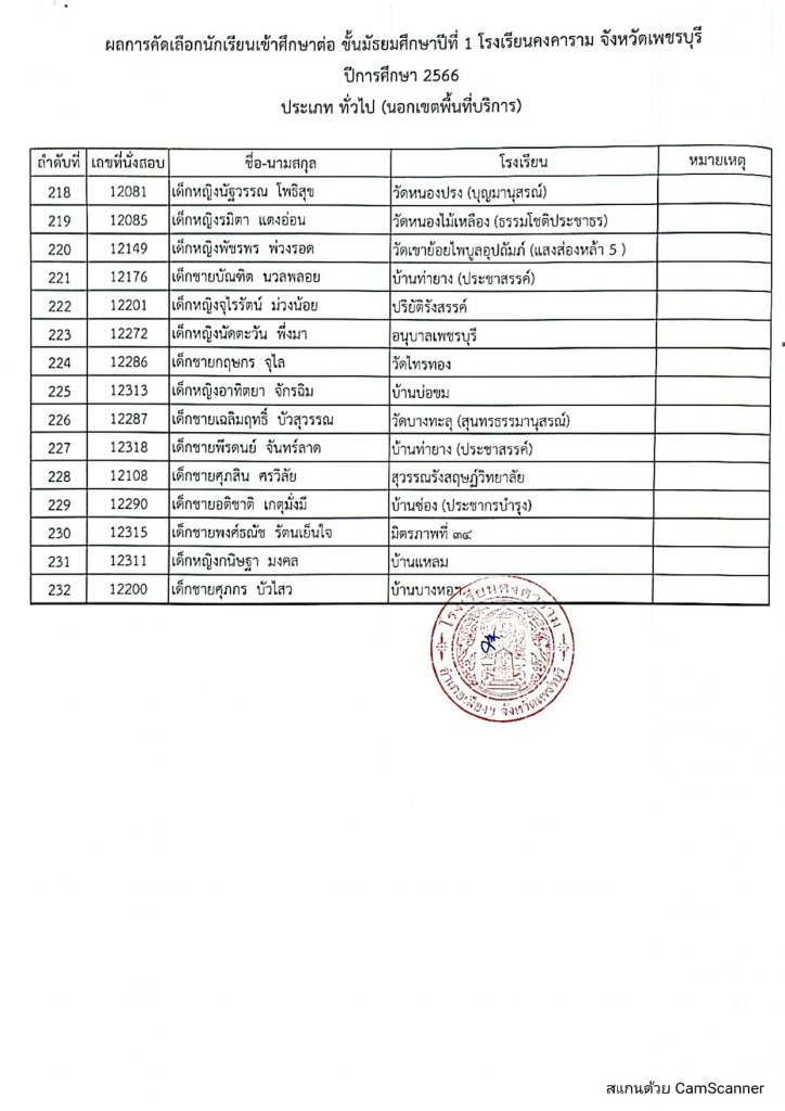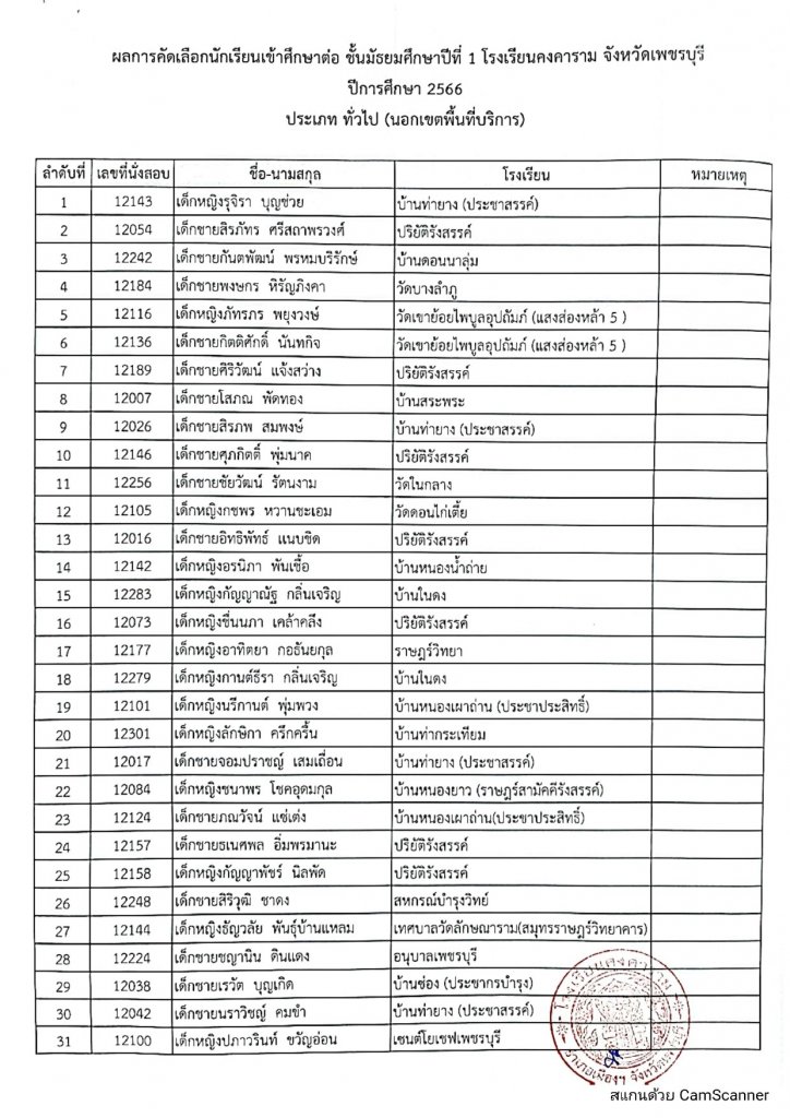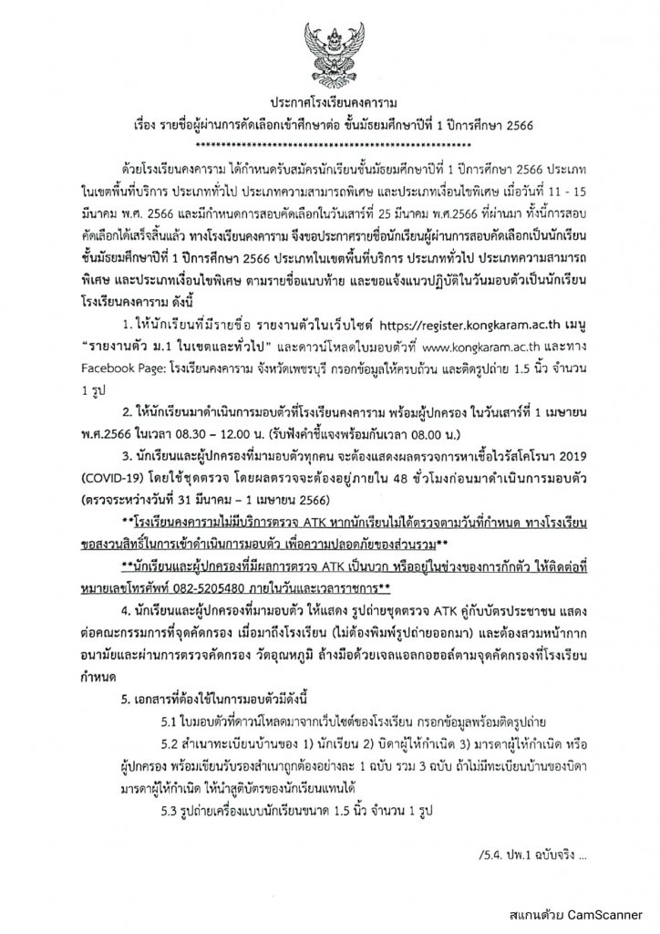 ด้วยโรงเรียนคงคาราม ได้กำหนดรับสมัครนักเรียนชั้นมัธยมศึกษาปีที่ 1 ปีการศึกษา 2566 ประเภท ในเขตพื้นที่บริการ ประเภททั่วไป ประเภทความสามารถพิเศษ และประเภทเงื่อนไขพิเศษ เมื่อวันที่ 11 – 15 มีนาคม พ.ศ. 2566 และมีกำหนดการสอบคัดเลือกในวันเสาร์ที่ 25 มีนาคม พ.ศ.2566 ที่ผ่านมา ทั้งนี้การสอบคัดเลือกได้เสร็จสิ้นแล้ว ทางโรงเรียนคงคาราม จึงขอประกาศรายชื่อนักเรียนผู้ผ่านการสอบคัดเลือกเป็นนักเรียนชั้นมัธยมศึกษาปีที่ 1 ปีการศึกษา 2566 ประเภทในเขตพื้นที่บริการ ประเภททั่วไป ประเภทความสามารถพิเศษ และประเภทเงื่อนไขพิเศษ ตามรายชื่อแนบท้าย และขอแจ้งแนวปฏิบัติในวันมอบตัวเป็นนักเรียนโรงเรียนคงคาราม ดังนี้