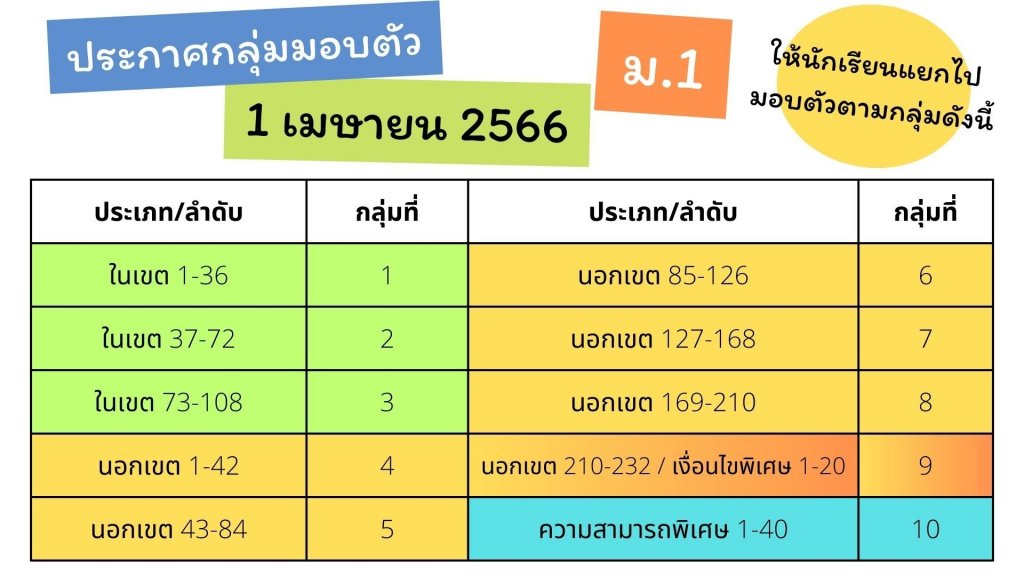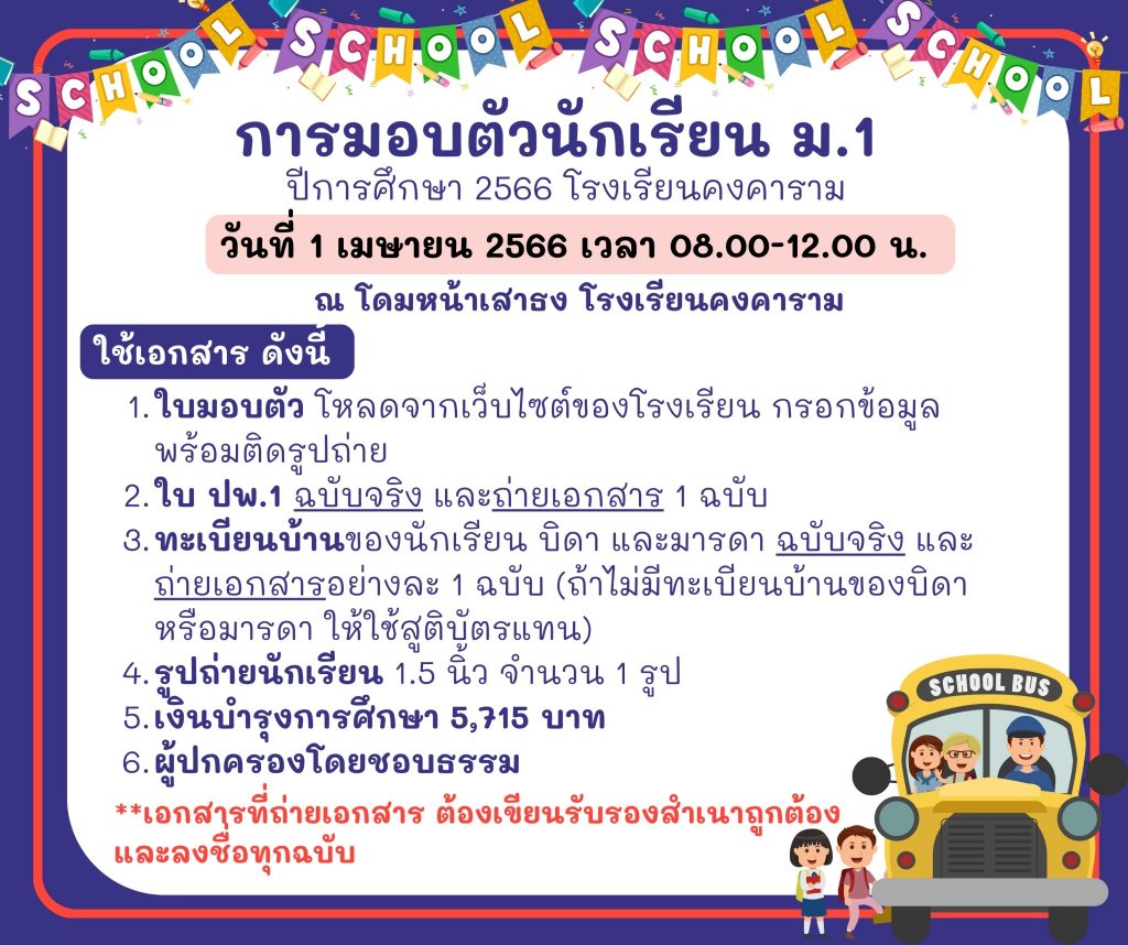 2. ให้นักเรียนมาดำเนินการมอบตัวที่โรงเรียนคงคาราม พร้อมผู้ปกครอง ในวันเสาร์ที่ 1 เมษายน พ.ศ.2566 ในเวลา 08.30 – 12.00 น. (รับฟังคำชี้แจงพร้อมกันเวลา 08.00 น.)
