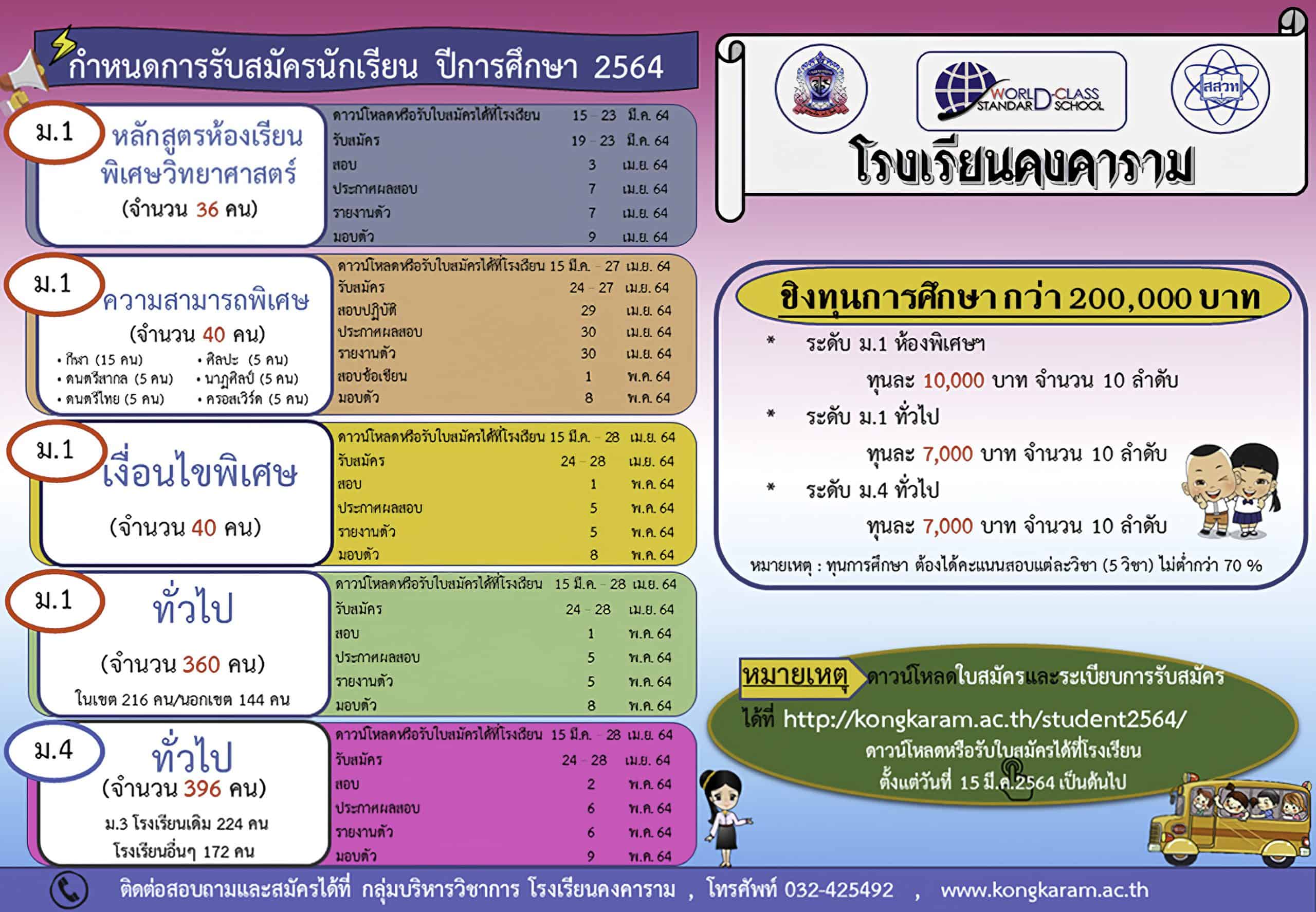 รับสมัครนักเรียน ปีการศึกษา2564 ประกาศโรงเรียนคงคาราม เรื่องการรับสมัครนักเรียน ปีการศึกษา 2564 ดาวน์โหลดเอกสารใบสมัคร และระเบียบการรับสมัครตามประเภทที่ต้องการสมัคร ประเภท ม.1 โครงการห้องเรียนพิเศษ หลักสูตรห้องเรียนพิเศษวิทยาศาสตร์ – ใบสมัครประเภท ม.1 ห้องเรียนพิเศษวิทยาศาสตร์ – ระเบียบการรับสมัคร ประเภท ม.1 ห้องเรียนพิเศษวิทยาศาสตร์ ประเภท ม.1 ทั่วไป – ใบสมัครประเภท ม.1 ทั่วไป – ระเบียบการรับสมัคร ม.1 ประเภททั่วไป ประเภท ม.4 ทั่วไป – ใบสมัครประเภท ม.4 ทั่วไป – ระเบียบการรับสมัคร ประเภท ม.4 ทั่วไป