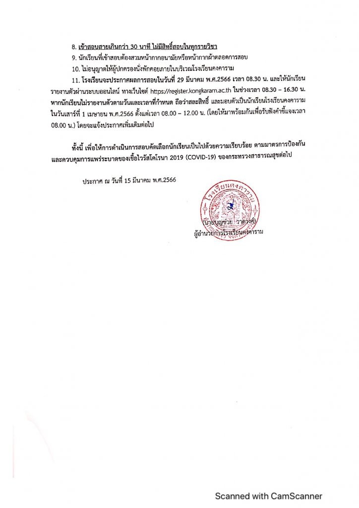 11. โรงเรียนจะประกาศผลการสอบในวันที่ 29 มีนาคม พ.ศ.2566 เวลา 08.30 น. และให้นักเรียนรายงานตัวผ่านระบบออนไลน์ ทางเว็บไซต์ https://register.kongkaram.ac.th ในช่วงเวลา 08.30 – 16.30 น. หากนักเรียนไม่รายงานตัวตามวันและเวลาที่กำหนด ถือว่าสละสิทธิ์ และมอบตัวเป็นนักเรียนโรงเรียนคงคาราม ในวันเสาร์ที่ 1 เมษายน พ.ศ.2566 ตั้งแต่เวลา 08.00 – 12.00 น. (โดยให้มาพร้อมกันเพื่อรับฟังคำชี้แจงเวลา 08.00 น.) โดยจะแจ้งประกาศเพิ่มเติมต่อไป